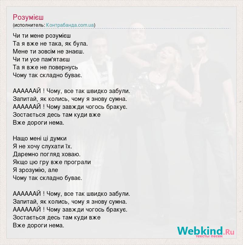 Чи ти мене розумієш Та я вже не така, як була. Мене ти зовсім не знаєш. Чи ти усе пам'ятаєш Та я вже не повернусь Чому так складно буває. ААААААЙ ! Чому, все так швидко забули. Запитай, як колись, чому я знову сумна. ААААААЙ ! Чому завжди чогось бракує. Зостається десь там куди вже Вже дороги нема. Нащо мені ці думки Я не хочу слухати їх. Даремно погляд ховаю. Якщо цю гру вже програли Я зрозумію, але Чому так складно буває. ААААААЙ ! Чому, все так швидко забули. Запитай, як колись, чому я знову сумна. ААААААЙ ! Чому завжди чогось бракує. Зостається десь там куди вже Вже дороги нема.