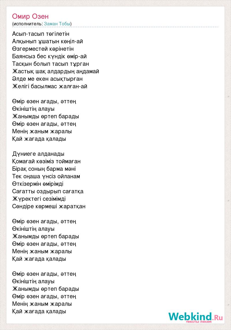 Асып-тасып төгілетін Алқынып ұшатын көңіл-ай Өзгерместей көрінетін Баянсыз бес күндік өмір-ай Тасқын болып тасып тұрган Жастық шақ алдардың аңдамай Әлде ме екен асықтырған Желігі басылмас жалған-ай Өмір өзен ағады, әттең Өкініштің алауы Жанымды өртеп барады Өмір өзен ағады, әттең Менің жаным жаралы Қай жағада қалады Дүниеге алданады Қомағай көзіміз тоймаған Бірақ соның барма мәні Тек оңаша үнсіз ойланам Өткізермін өмірімді Сағатты оздырып сағатқа Жүректегі сезімімді Сөндіре көрмеші жаратқан Өмір өзен ағады, әттең Өкініштің алауы Жанымды өртеп барады Өмір өзен ағады, әттең Менің жаным жаралы Қай жағада қалады Өмір өзен ағады, әттең Өкініштің алауы Жанымды өртеп барады Өмір өзен ағады, әттең Менің жаным жаралы Қай жағада қалады