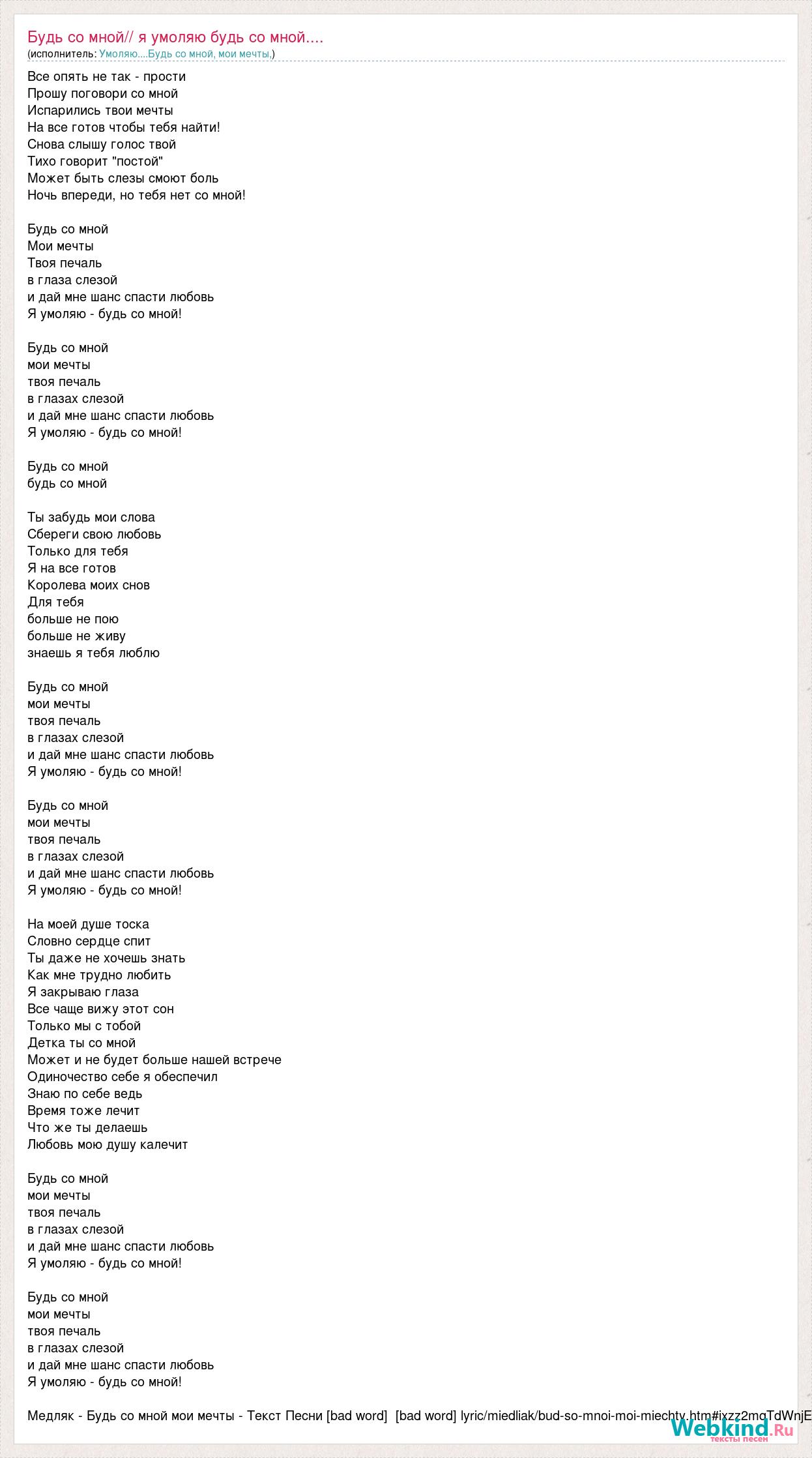 Все опять не так - прости Прошу поговори со мной Испарились твои мечты На все готов чтобы тебя найти! Снова слышу голос твой Тихо говорит "постой" Может быть слезы смоют боль Ночь впереди, но тебя нет со мной! Будь со мной Мои мечты Твоя печаль в глаза слезой и дай мне шанс спасти любовь Я умоляю - будь со мной! Будь со мной мои мечты твоя печаль в глазах слезой и дай мне шанс спасти любовь Я умоляю - будь со мной! Будь со мной будь со мной Ты забудь мои слова Сбереги свою любовь Только для тебя Я на все готов Королева моих снов Для тебя больше не пою больше не живу знаешь я тебя люблю Будь со мной мои мечты твоя печаль в глазах слезой и дай мне шанс спасти любовь Я умоляю - будь со мной! Будь со мной мои мечты твоя печаль в глазах слезой и дай мне шанс спасти любовь Я умоляю - будь со мной! На моей душе тоска Словно сердце спит Ты даже не хочешь знать Как мне трудно любить Я закрываю глаза Все чаще вижу этот сон Только мы с тобой Детка ты со мной Может и не будет больше нашей встрече Одиночество себе я обеспечил Знаю по себе ведь Время тоже лечит Что же ты делаешь Любовь мою душу калечит Будь со мной мои мечты твоя печаль в глазах слезой и дай мне шанс спасти любовь Я умоляю - будь со мной! Будь со мной мои мечты твоя печаль в глазах слезой и дай мне шанс спасти любовь Я умоляю - будь со мной! Медляк - Будь со мной мои мечты - Текст Песни [bad word] [bad word] lyric/miedliak/bud-so-mnoi-moi-miechty.htm#ixzz2mqTdWnjE