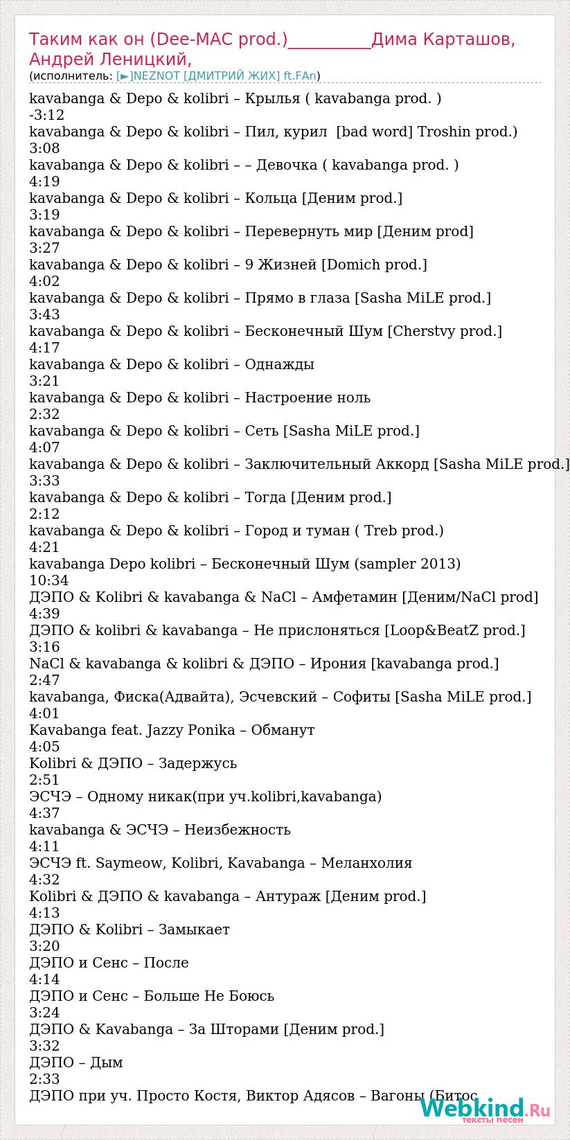 kavabanga & Depo & kolibri – Крылья ( kavabanga prod. ) -3:12 kavabanga & Depo & kolibri – Пил, курил [bad word] Troshin prod.) 3:08 kavabanga & Depo & kolibri – – Девочка ( kavabanga prod. ) 4:19 kavabanga & Depo & kolibri – Кольца [Деним prod.] 3:19 kavabanga & Depo & kolibri – Перевернуть мир [Деним prod] 3:27 kavabanga & Depo & kolibri – 9 Жизней [Domich prod.] 4:02 kavabanga & Depo & kolibri – Прямо в глаза [Sasha MiLE prod.] 3:43 kavabanga & Depo & kolibri – Бесконечный Шум [Cherstvy prod.] 4:17 kavabanga & Depo & kolibri – Однажды 3:21 kavabanga & Depo & kolibri – Настроение ноль 2:32 kavabanga & Depo & kolibri – Сеть [Sasha MiLE prod.] 4:07 kavabanga & Depo & kolibri – Заключительный Аккорд [Sasha MiLE prod.] 3:33 kavabanga & Depo & kolibri – Тогда [Деним prod.] 2:12 kavabanga & Depo & kolibri – Город и туман ( Treb prod.) 4:21 kavabanga Depo kolibri – Бесконечный Шум (sampler 2013) 10:34 ДЭПО & Kolibri & kavabanga & NaCl – Амфетамин [Деним/NaCl prod] 4:39 ДЭПО & kolibri & kavabanga – Не прислоняться [Loop&BeatZ prod.] 3:16 NaCl & kavabanga & kolibri & ДЭПО – Ирония [kavabanga prod.] 2:47 kavabanga, Фиска(Адвайта), Эсчевский – Софиты [Sasha MiLE prod.] 4:01 Kavabanga feat. Jazzy Ponika – Обманут 4:05 Kolibri & ДЭПО – Задержусь 2:51 ЭСЧЭ – Одному никак(при уч.kolibri,kavabanga) 4:37 kavabanga & ЭСЧЭ – Неизбежность 4:11 ЭСЧЭ ft. Saymeow, Kolibri, Kavabanga – Меланхолия 4:32 Kolibri & ДЭПО & kavabanga – Антураж [Деним prod.] 4:13 ДЭПО & Kolibri – Замыкает 3:20 ДЭПО и Сенс – После 4:14 ДЭПО и Сенс – Больше Не Боюсь 3:24 ДЭПО & Kavabanga – За Шторами [Деним prod.] 3:32 ДЭПО – Дым 2:33 ДЭПО при уч. Просто Костя, Виктор Адясов – Вагоны (Битос