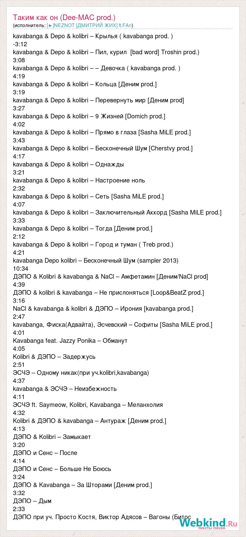 kavabanga & Depo & kolibri – Крылья ( kavabanga prod. ) -3:12 kavabanga & Depo & kolibri – Пил, курил [bad word] Troshin prod.) 3:08 kavabanga & Depo & kolibri – – Девочка ( kavabanga prod. ) 4:19 kavabanga & Depo & kolibri – Кольца [Деним prod.] 3:19 kavabanga & Depo & kolibri – Перевернуть мир [Деним prod] 3:27 kavabanga & Depo & kolibri – 9 Жизней [Domich prod.] 4:02 kavabanga & Depo & kolibri – Прямо в глаза [Sasha MiLE prod.] 3:43 kavabanga & Depo & kolibri – Бесконечный Шум [Cherstvy prod.] 4:17 kavabanga & Depo & kolibri – Однажды 3:21 kavabanga & Depo & kolibri – Настроение ноль 2:32 kavabanga & Depo & kolibri – Сеть [Sasha MiLE prod.] 4:07 kavabanga & Depo & kolibri – Заключительный Аккорд [Sasha MiLE prod.] 3:33 kavabanga & Depo & kolibri – Тогда [Деним prod.] 2:12 kavabanga & Depo & kolibri – Город и туман ( Treb prod.) 4:21 kavabanga Depo kolibri – Бесконечный Шум (sampler 2013) 10:34 ДЭПО & Kolibri & kavabanga & NaCl – Амфетамин [Деним/NaCl prod] 4:39 ДЭПО & kolibri & kavabanga – Не прислоняться [Loop&BeatZ prod.] 3:16 NaCl & kavabanga & kolibri & ДЭПО – Ирония [kavabanga prod.] 2:47 kavabanga, Фиска(Адвайта), Эсчевский – Софиты [Sasha MiLE prod.] 4:01 Kavabanga feat. Jazzy Ponika – Обманут 4:05 Kolibri & ДЭПО – Задержусь 2:51 ЭСЧЭ – Одному никак(при уч.kolibri,kavabanga) 4:37 kavabanga & ЭСЧЭ – Неизбежность 4:11 ЭСЧЭ ft. Saymeow, Kolibri, Kavabanga – Меланхолия 4:32 Kolibri & ДЭПО & kavabanga – Антураж [Деним prod.] 4:13 ДЭПО & Kolibri – Замыкает 3:20 ДЭПО и Сенс – После 4:14 ДЭПО и Сенс – Больше Не Боюсь 3:24 ДЭПО & Kavabanga – За Шторами [Деним prod.] 3:32 ДЭПО – Дым 2:33 ДЭПО при уч. Просто Костя, Виктор Адясов – Вагоны (Битос