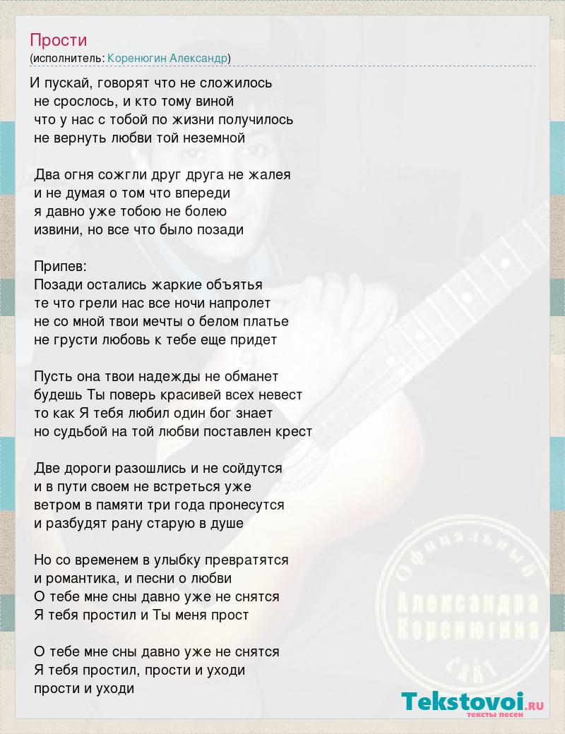 И пускай, говорят что не сложилось не срослось, и кто тому виной что у нас с тобой по жизни получилось не вернуть любви той неземной Два огня сожгли друг друга не жалея и не думая о том что впереди я давно уже тобою не болею извини, но все что было позади Припев: Позади остались жаркие объятья те что грели нас все ночи напролет не со мной твои мечты о белом платье не грусти любовь к тебе еще придет Пусть она твои надежды не обманет будешь Ты поверь красивей всех невест то как Я тебя любил один бог знает но судьбой на той любви поставлен крест Две дороги разошлись и не сойдутся и в пути своем не встреться уже ветром в памяти три года пронесутся и разбудят рану старую в душе Но со временем в улыбку превратятся и романтика, и песни о любви О тебе мне сны давно уже не снятся Я тебя простил и Ты меня прост О тебе мне сны давно уже не снятся Я тебя простил, прости и уходи прости и уходи