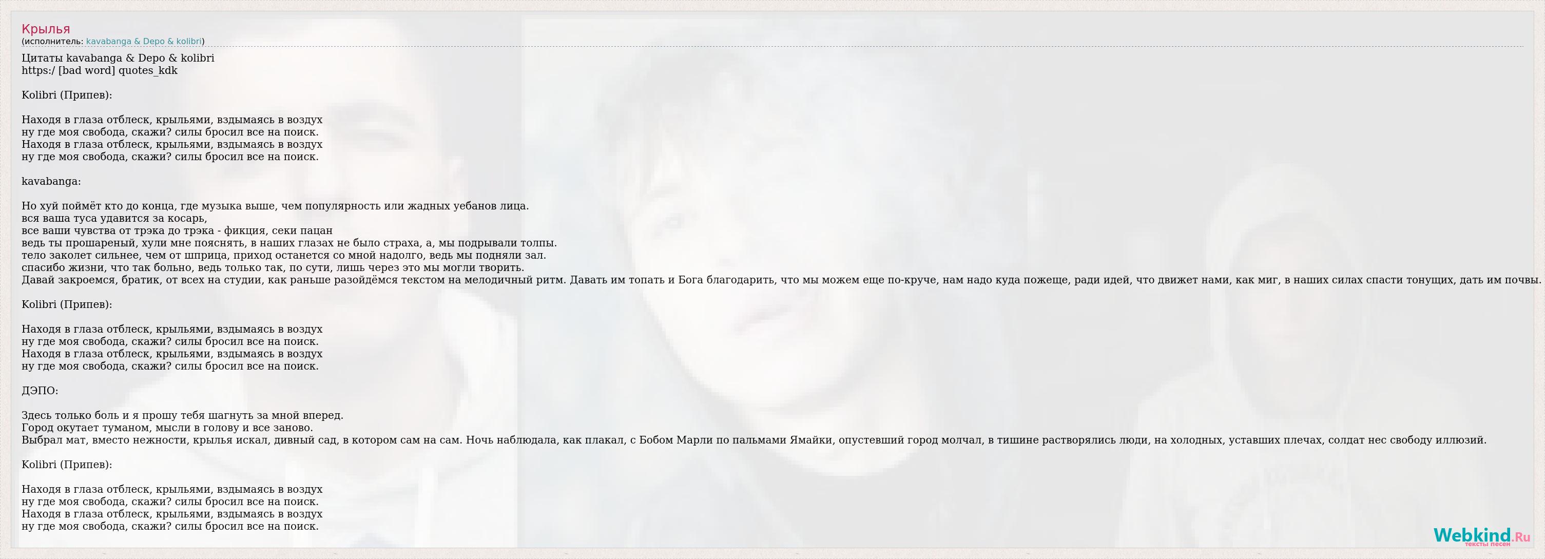 Цитаты kavabanga & Depo & kolibri https:/ [bad word] quotes_kdk Kolibri (Припев): Находя в глаза отблеск, крыльями, вздымаясь в воздух ну где моя свобода, скажи? силы бросил все на поиск. Находя в глаза отблеск, крыльями, вздымаясь в воздух ну где моя свобода, скажи? силы бросил все на поиск. kavabanga: Но хуй поймёт кто до конца, где музыка выше, чем популярность или жадных уебанов лица. вся ваша туса удавится за косарь, все ваши чувства от трэка до трэка - фикция, секи пацан ведь ты прошареный, хули мне пояснять, в наших глазах не было страха, а, мы подрывали толпы. тело заколет сильнее, чем от шприца, приход останется со мной надолго, ведь мы подняли зал. спасибо жизни, что так больно, ведь только так, по сути, лишь через это мы могли творить. Давай закроемся, братик, от всех на студии, как раньше разойдёмся текстом на мелодичный ритм. Давать им топать и Бога благодарить, что мы можем еще по-круче, нам надо куда пожеще, ради идей, что движет нами, как миг, в наших силах спасти тонущих, дать им почвы. Kolibri (Припев): Находя в глаза отблеск, крыльями, вздымаясь в воздух ну где моя свобода, скажи? силы бросил все на поиск. Находя в глаза отблеск, крыльями, вздымаясь в воздух ну где моя свобода, скажи? силы бросил все на поиск. ДЭПО: Здесь только боль и я прошу тебя шагнуть за мной вперед. Город окутает туманом, мысли в голову и все заново. Выбрал мат, вместо нежности, крылья искал, дивный сад, в котором сам на сам. Ночь наблюдала, как плакал, с Бобом Марли по пальмами Ямайки, опустевший город молчал, в тишине растворялись люди, на холодных, уставших плечах, солдат нес свободу иллюзий. Kolibri (Припев): Находя в глаза отблеск, крыльями, вздымаясь в воздух ну где моя свобода, скажи? силы бросил все на поиск. Находя в глаза отблеск, крыльями, вздымаясь в воздух ну где моя свобода, скажи? силы бросил все на поиск.