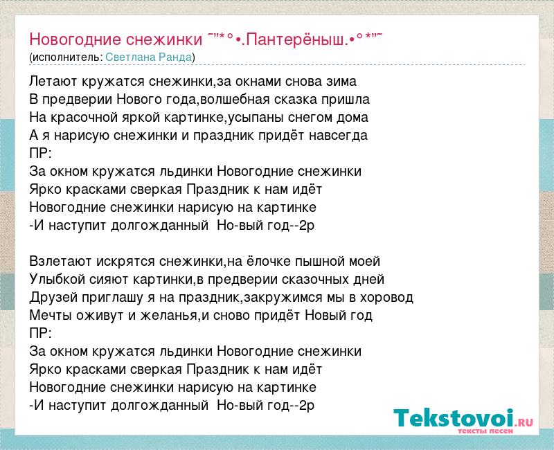 Летают кружатся снежинки,за окнами снова зима В предверии Нового года,волшебная сказка пришла На красочной яркой картинке,усыпаны снегом дома А я нарисую снежинки и праздник придёт навсегда ПР: За окном кружатся льдинки Новогодние снежинки Ярко красками сверкая Праздник к нам идёт Новогодние снежинки нарисую на картинке -И наступит долгожданный Но-вый год--2р Взлетают искрятся снежинки,на ёлочке пышной моей Улыбкой сияют картинки,в предверии сказочных дней Друзей приглашу я на праздник,закружимся мы в хоровод Мечты оживут и желанья,и сново придёт Новый год ПР: За окном кружатся льдинки Новогодние снежинки Ярко красками сверкая Праздник к нам идёт Новогодние снежинки нарисую на картинке -И наступит долгожданный Но-вый год--2р