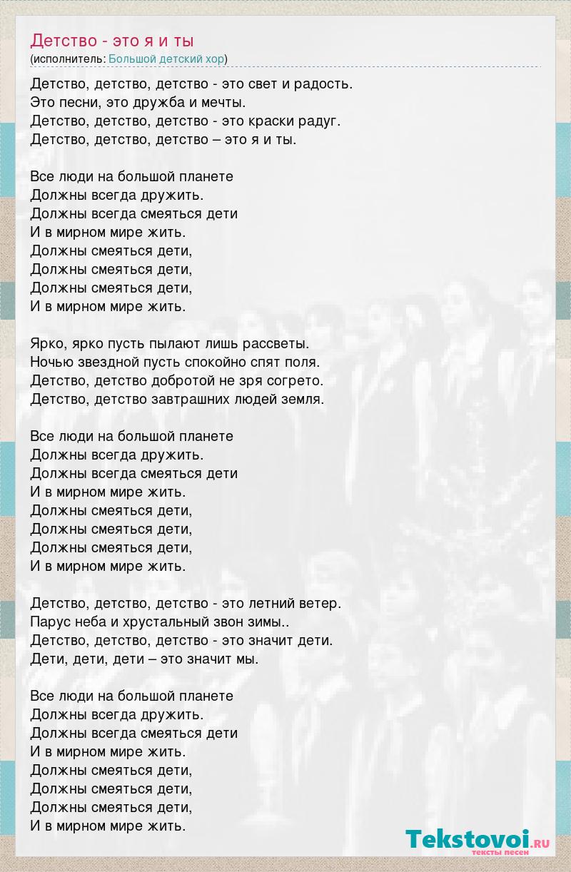 Детство, детство, детство - это свет и радость. Это песни, это дружба и мечты. Детство, детство, детство - это краски радуг. Детство, детство, детство – это я и ты. Все люди на большой планете Должны всегда дружить. Должны всегда смеяться дети И в мирном мире жить. Должны смеяться дети, Должны смеяться дети, Должны смеяться дети, И в мирном мире жить. Ярко, ярко пусть пылают лишь рассветы. Ночью звездной пусть спокойно спят поля. Детство, детство добротой не зря согрето. Детство, детство завтрашних людей земля. Все люди на большой планете Должны всегда дружить. Должны всегда смеяться дети И в мирном мире жить. Должны смеяться дети, Должны смеяться дети, Должны смеяться дети, И в мирном мире жить. Детство, детство, детство - это летний ветер. Парус неба и хрустальный звон зимы.. Детство, детство, детство - это значит дети. Дети, дети, дети – это значит мы. Все люди на большой планете Должны всегда дружить. Должны всегда смеяться дети И в мирном мире жить. Должны смеяться дети, Должны смеяться дети, Должны смеяться дети, И в мирном мире жить.