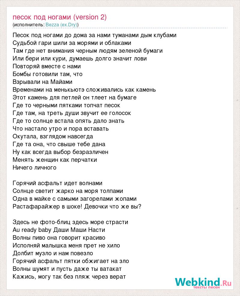 Песок под ногами до дома за нами туманами дым клубами Судьбой гари шили за морями и облаками Там где нет внимания черным людям зеленой бумаги Или бери или кури, думаешь долго значит лови Повторяй вместе с нами Бомбы готовили там, что Взрывали на Майами Временами на менькьютэ сложивались как камень Этот камень для петлей он тлеет на бумаге Где то черными пятками топчат песок Где там, на треть души звучит ее голосок Где то солнце встала опять дало знать Что настало утро и пора вставать Окутала, взглядом навсегда Где та она, что свыше тебе дана Ну как всегда выбор безразличен Менять женщин как перчатки Ничего личного Горячий асфальт идет волнами Солнце светит жарко на моря толпами Одна в майке с самыми загорелами жопами Растафарайжер в шоке! Девочки что же вы? Здесь не фото-блиц здесь море страсти Au ready baby Даши Маши Насти Волны пиво она говорит красиво Исполняй малышка меня прет не хило Долбит музло и нам повезло Горячий асфальт пятки обжигает на зло Волны шумят и пусть даже ты ватакат Кажись, могу так без пляж через верат