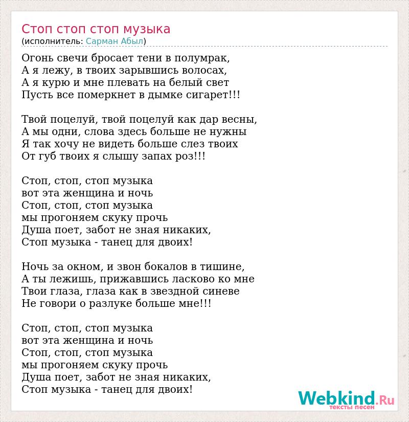 Огонь свечи бросает тени в полумрак, А я лежу, в твоих зарывшись волосах, А я курю и мне плевать на белый свет Пусть все померкнет в дымке сигарет!!! Твой поцелуй, твой поцелуй как дар весны, А мы одни, слова здесь больше не нужны Я так хочу не видеть больше слез твоих От губ твоих я слышу запах роз!!! Стоп, стоп, стоп музыка вот эта женщина и ночь Стоп, стоп, стоп музыка мы прогоняем скуку прочь Душа поет, забот не зная никаких, Стоп музыка - танец для двоих! Ночь за окном, и звон бокалов в тишине, А ты лежишь, прижавшись ласково ко мне Твои глаза, глаза как в звездной синеве Не говори о разлуке больше мне!!! Стоп, стоп, стоп музыка вот эта женщина и ночь Стоп, стоп, стоп музыка мы прогоняем скуку прочь Душа поет, забот не зная никаких, Стоп музыка - танец для двоих!