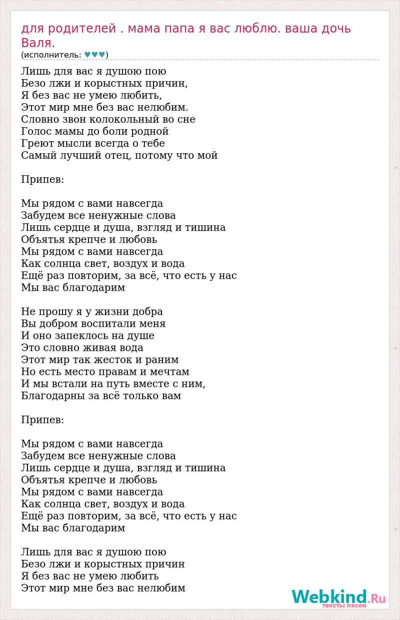 Лишь для вас я душою пою Безо лжи и корыстных причин, Я без вас не умею любить, Этот мир мне без вас нелюбим. Словно звон колокольный во сне Голос мамы до боли родной Греют мысли всегда о тебе Самый лучший отец, потому что мой Припев: Мы рядом с вами навсегда Забудем все ненужные слова Лишь сердце и душа, взгляд и тишина Объятья крепче и любовь Мы рядом с вами навсегда Как солнца свет, воздух и вода Ещё раз повторим, за всё, что есть у нас Мы вас благодарим Не прошу я у жизни добра Вы добром воспитали меня И оно запеклось на душе Это словно живая вода Этот мир так жесток и раним Но есть место правам и мечтам И мы встали на путь вместе с ним, Благодарны за всё только вам Припев: Мы рядом с вами навсегда Забудем все ненужные слова Лишь сердце и душа, взгляд и тишина Объятья крепче и любовь Мы рядом с вами навсегда Как солнца свет, воздух и вода Ещё раз повторим, за всё, что есть у нас Мы вас благодарим Лишь для вас я душою пою Безо лжи и корыстных причин Я без вас не умею любить Этот мир мне без вас нелюбим