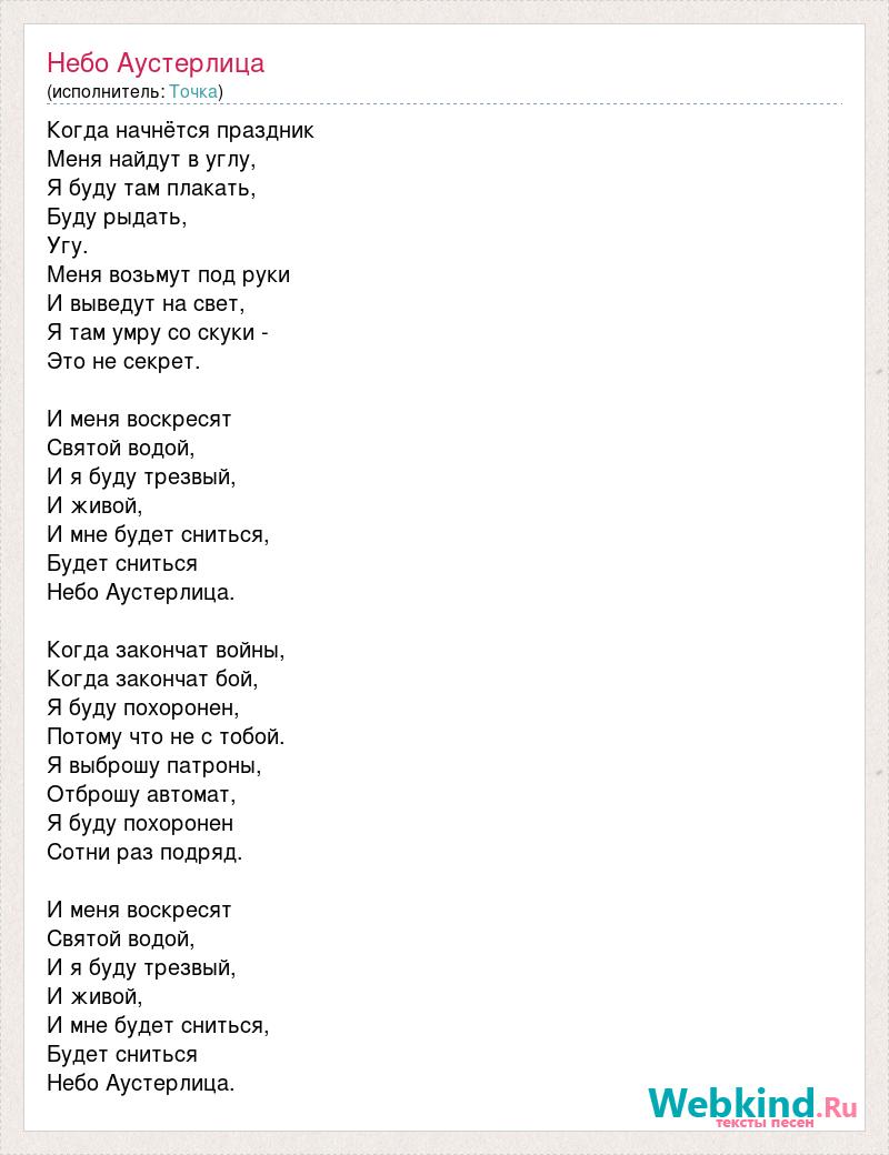 Когда начнётся праздник Меня найдут в углу, Я буду там плакать, Буду рыдать, Угу. Меня возьмут под руки И выведут на свет, Я там умру со скуки - Это не секрет. И меня воскресят Святой водой, И я буду трезвый, И живой, И мне будет сниться, Будет сниться Небо Аустерлица. Когда закончат войны, Когда закончат бой, Я буду похоронен, Потому что не с тобой. Я выброшу патроны, Отброшу автомат, Я буду похоронен Сотни раз подряд. И меня воскресят Святой водой, И я буду трезвый, И живой, И мне будет сниться, Будет сниться Небо Аустерлица.