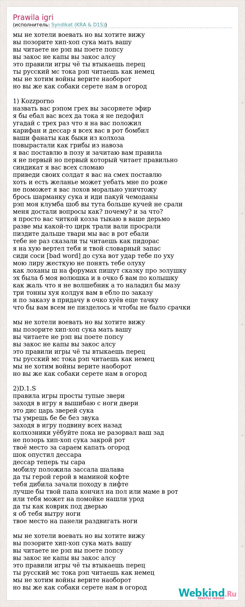 мы не хотели воевать но вы хотите вижу вы позорите хип-хоп сука мать вашу вы читаете не рэп вы поете попсу вы закос не капы вы закос алсу это правили игры чё ты втыкаешь перец ты русский мс тока рэп читаешь как немец мы не хотим войны верите наоборот но вы же как собаки серете нам в огород 1) Kozzporno назвать вас рэпом грех вы засоряете эфир я бы ебал вас всех да тока я не педофил угадай с трех раз что я на вас положил карифан и дессар я всех вас в рот бомбил ваши фанаты как быки из колхоза повырастали как грибы из навоза я вас поставлю в позу и зачитаю вам правила я не первый но первый который читает правильно синдикат я вас всех сломаю приведи своих солдат я вас на смех поставлю хоть и есть желанье может уебать мне по роже не поможет я вас лохов морально уничтожу брось шарманку сука и иди пакуй чемоданы рэп моя клумба шоб вы тута больше кучей не срали меня достали вопросы как? почему? и за что? я просто вас читкой козза тыкаю в ваше дерьмо разве мы какой-то цирк трали вали просрали пиздите дальше твари мы вас в рот ебали тебе не раз сказали ты читаешь как пидорас я на хую вертел тебя и твой словарный запас сиди соси [bad word] до суха вот удар тебе по уху мою лиру жесткую не понять тебе олуху как лоханы ш на форумах пишут сказку про золушку эх была б моя волюшка и в очко б вам по колышку как жаль что я не волшебник а то наладил бы мазу три тонны хуя колдуя вам в ебло по заказу и по заказу в придачу в очко хуёв еще тачку что бы вам всем не пизделось и чтобы не было срачки мы не хотели воевать но вы хотите вижу вы позорите хип-хоп сука мать вашу вы читаете не рэп вы поете попсу вы закос не капы вы закос алсу это правили игры чё ты втыкаешь перец ты русский мс тока рэп читаешь как немец мы не хотим войны верите наоборот но вы же как собаки серете нам в огород 2)D.1.S правила игры просты тупые звери заходя в игру я вышибаю с ноги двери это дис царь зверей сука ты умрешь бе бе без звука заходя в игру подвину всех назад колхозники уёбуйте пока не разорвал ваш зад не позорь хип-хоп сука закрой рот твоё место за сараем капать огород шок опустил дессара дессар теперь ты сара мобилу положила зассала шалава да ты герой герой в маминой кофте тебя дибила зачали походу в лифте лучше бы твой папа кончил на пол или маме в рот или тебя может на помойке нашли урод да ты как коврик под дверью я об тебя вытру ноги твое место на панели раздвигать ноги мы не хотели воевать но вы хотите вижу вы позорите хип-хоп сука мать вашу вы читаете не рэп вы поете попсу вы закос не капы вы закос алсу это правили игры чё ты втыкаешь перец ты русский мс тока рэп читаешь как немец мы не хотим войны верите наоборот но вы же как собаки серете нам в огород