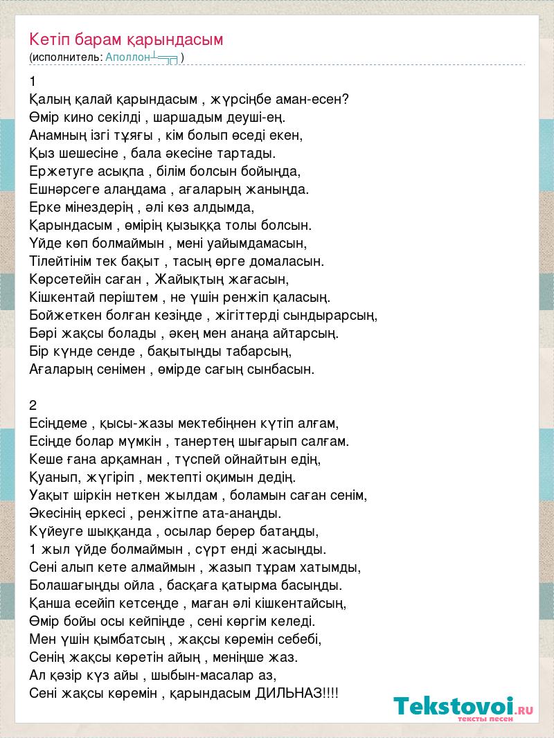 1 Қалың қалай қарындасым , жүрсіңбе аман-есен? Өмір кино секілді , шаршадым деуші-ең. Анамның ізгі тұяғы , кім болып өседі екен, Қыз шешесіне , бала әкесіне тартады. Ержетуге асықпа , білім болсын бойыңда, Ешнәрсеге алаңдама , ағаларың жаныңда. Ерке мінездерің , әлі көз алдымда, Қарындасым , өмірің қызыққа толы болсын. Үйде көп болмаймын , мені уайымдамасын, Тілейтінім тек бақыт , тасың өрге домаласын. Көрсетейін саған , Жайықтың жағасын, Кішкентай періштем , не үшін ренжіп қаласың. Бойжеткен болған кезіңде , жігіттерді сындырарсың, Бәрі жақсы болады , әкең мен анаңа айтарсың. Бір күнде сенде , бақытыңды табарсың, Ағаларың сенімен , өмірде сағың сынбасын. 2 Есіңдеме , қысы-жазы мектебіңнен күтіп алғам, Есіңде болар мүмкін , танертең шығарып салғам. Кеше ғана арқамнан , түспей ойнайтын едің, Қуанып, жүгіріп , мектепті оқимын дедің. Уақыт шіркін неткен жылдам , боламын саған сенім, Әкесінің еркесі , ренжітпе ата-анаңды. Күйеуге шыққанда , осылар берер батаңды, 1 жыл үйде болмаймын , сүрт енді жасыңды. Сені алып кете алмаймын , жазып тұрам хатымды, Болашағыңды ойла , басқаға қатырма басыңды. Қанша есейіп кетсеңде , маған әлі кішкентайсың, Өмір бойы осы кейпіңде , сені көргім келеді. Мен үшін қымбатсың , жақсы көремін себебі, Сенің жақсы көретін айың , меніңше жаз. Ал қәзір күз айы , шыбын-масалар аз, Сені жақсы көремін , қарындасым ДИЛЬНАЗ!!!!