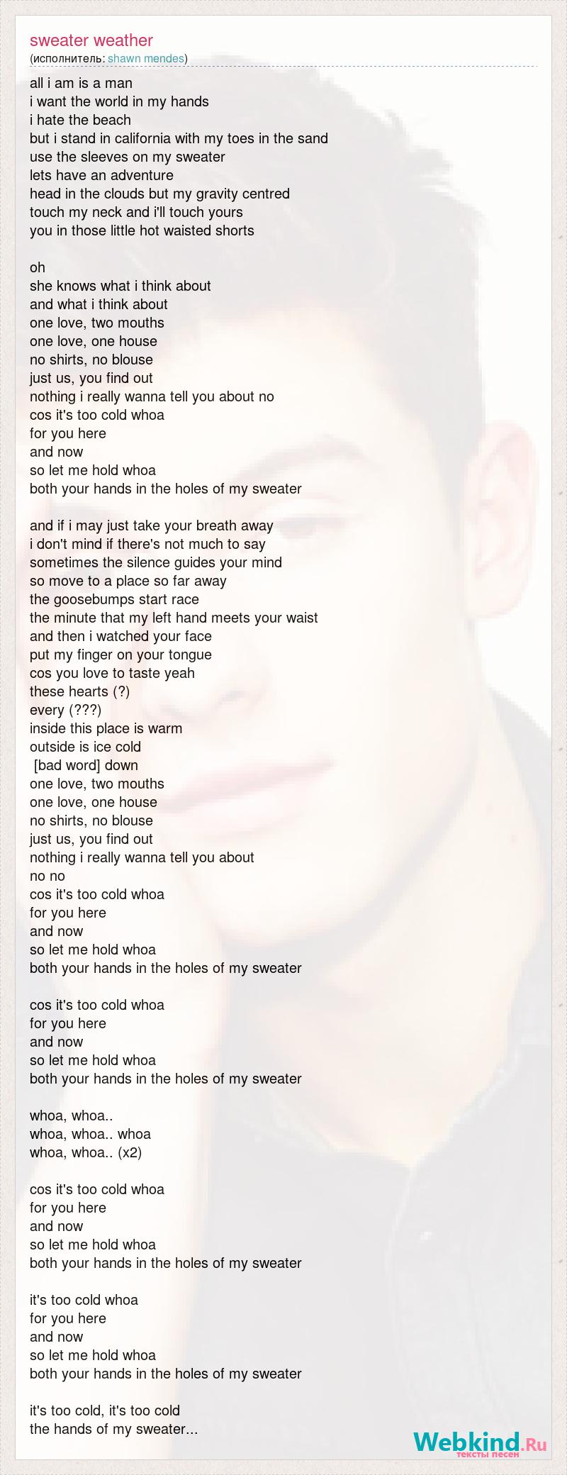 all i am is a man i want the world in my hands i hate the beach but i stand in california with my toes in the sand use the sleeves on my sweater lets have an adventure head in the clouds but my gravity centred touch my neck and i'll touch yours you in those little hot waisted shorts oh she knows what i think about and what i think about one love, two mouths one love, one house no shirts, no blouse just us, you find out nothing i really wanna tell you about no cos it's too cold whoa for you here and now so let me hold whoa both your hands in the holes of my sweater and if i may just take your breath away i don't mind if there's not much to say sometimes the silence guides your mind so move to a place so far away the goosebumps start race the minute that my left hand meets your waist and then i watched your face put my finger on your tongue cos you love to taste yeah these hearts (?) every (???) inside this place is warm outside is ice cold [bad word] down one love, two mouths one love, one house no shirts, no blouse just us, you find out nothing i really wanna tell you about no no cos it's too cold whoa for you here and now so let me hold whoa both your hands in the holes of my sweater cos it's too cold whoa for you here and now so let me hold whoa both your hands in the holes of my sweater whoa, whoa.. whoa, whoa.. whoa whoa, whoa.. (x2) cos it's too cold whoa for you here and now so let me hold whoa both your hands in the holes of my sweater it's too cold whoa for you here and now so let me hold whoa both your hands in the holes of my sweater it's too cold, it's too cold the hands of my sweater...