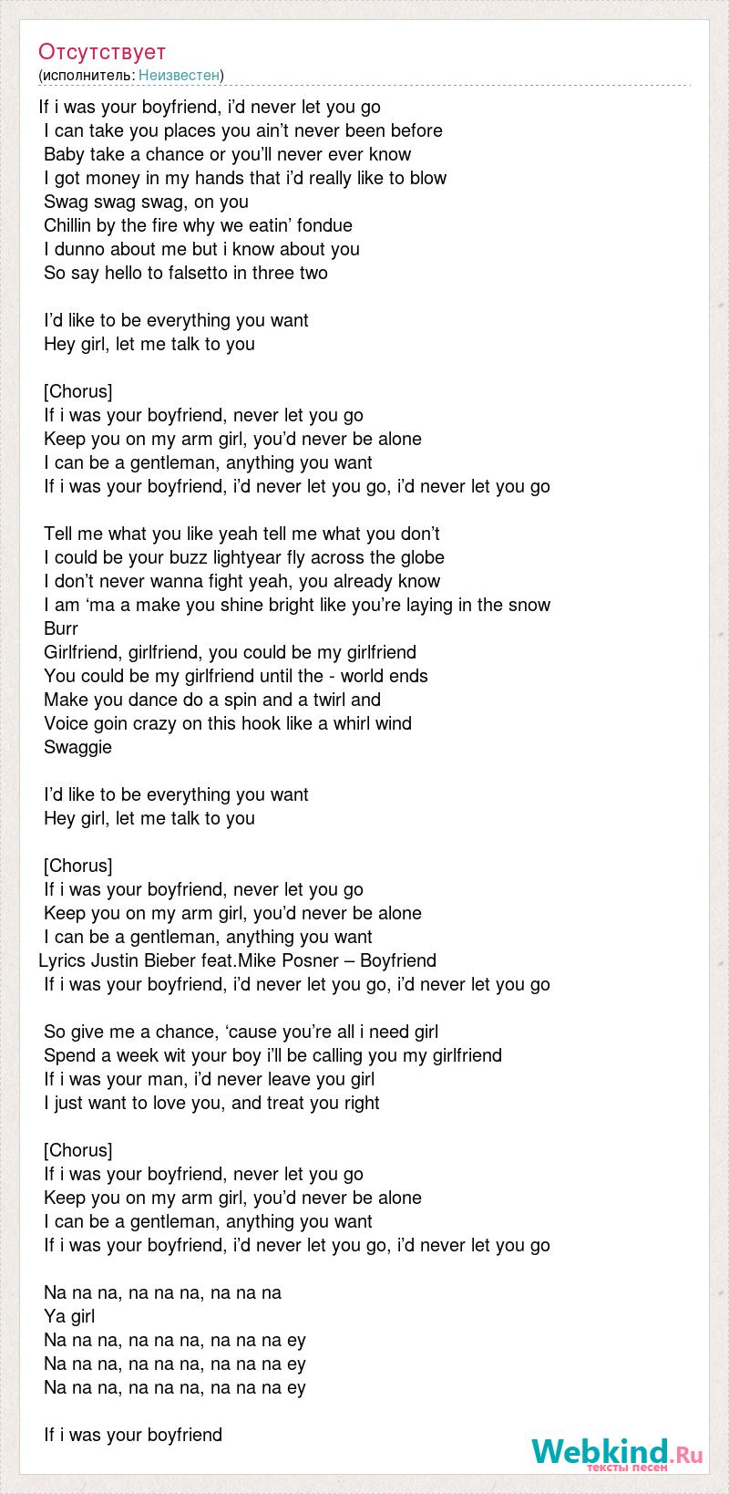 If i was your boyfriend, i’d never let you go I can take you places you ain’t never been before Baby take a chance or you’ll never ever know I got money in my hands that i’d really like to blow Swag swag swag, on you Chillin by the fire why we eatin’ fondue I dunno about me but i know about you So say hello to falsetto in three two I’d like to be everything you want Hey girl, let me talk to you [Chorus] If i was your boyfriend, never let you go Keep you on my arm girl, you’d never be alone I can be a gentleman, anything you want If i was your boyfriend, i’d never let you go, i’d never let you go Tell me what you like yeah tell me what you don’t I could be your buzz lightyear fly across the globe I don’t never wanna fight yeah, you already know I am ‘ma a make you shine bright like you’re laying in the snow Burr Girlfriend, girlfriend, you could be my girlfriend You could be my girlfriend until the - world ends Make you dance do a spin and a twirl and Voice goin crazy on this hook like a whirl wind Swaggie I’d like to be everything you want Hey girl, let me talk to you [Chorus] If i was your boyfriend, never let you go Keep you on my arm girl, you’d never be alone I can be a gentleman, anything you want Lyrics Justin Bieber feat.Mike Posner – Boyfriend If i was your boyfriend, i’d never let you go, i’d never let you go So give me a chance, ‘cause you’re all i need girl Spend a week wit your boy i’ll be calling you my girlfriend If i was your man, i’d never leave you girl I just want to love you, and treat you right [Chorus] If i was your boyfriend, never let you go Keep you on my arm girl, you’d never be alone I can be a gentleman, anything you want If i was your boyfriend, i’d never let you go, i’d never let you go Na na na, na na na, na na na Ya girl Na na na, na na na, na na na ey Na na na, na na na, na na na ey Na na na, na na na, na na na ey If i was your boyfriend