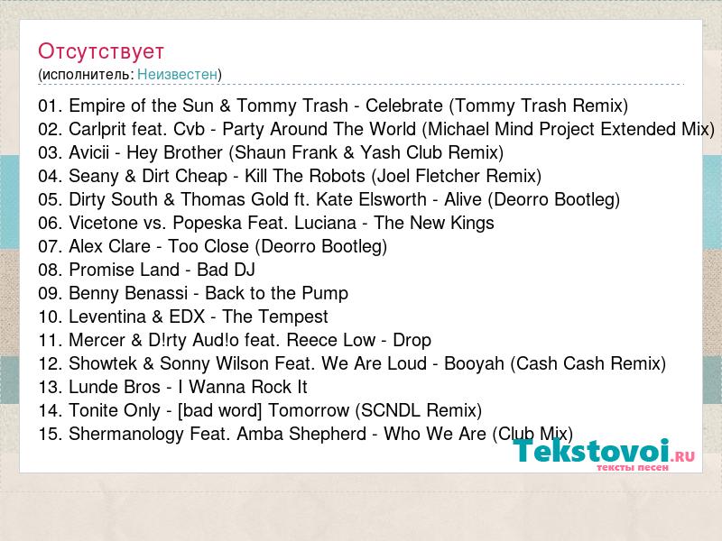 01. Empire of the Sun & Tommy Trash - Celebrate (Tommy Trash Remix) 02. Carlprit feat. Cvb - Party Around The World (Michael Mind Project Extended Mix) 03. Avicii - Hey Brother (Shaun Frank & Yash Club Remix) 04. Seany & Dirt Cheap - Kill The Robots (Joel Fletcher Remix) 05. Dirty South & Thomas Gold ft. Kate Elsworth - Alive (Deorro Bootleg) 06. Vicetone vs. Popeska Feat. Luciana - The New Kings 07. Alex Clare - Too Close (Deorro Bootleg) 08. Promise Land - Bad DJ 09. Benny Benassi - Back to the Pump 10. Leventina & EDX - The Tempest 11. Mercer & D!rty Aud!o feat. Reece Low - Drop 12. Showtek & Sonny Wilson Feat. We Are Loud - Booyah (Cash Cash Remix) 13. Lunde Bros - I Wanna Rock It 14. Tonite Only - [bad word] Tomorrow (SCNDL Remix) 15. Shermanology Feat. Amba Shepherd - Who We Are (Club Mix)