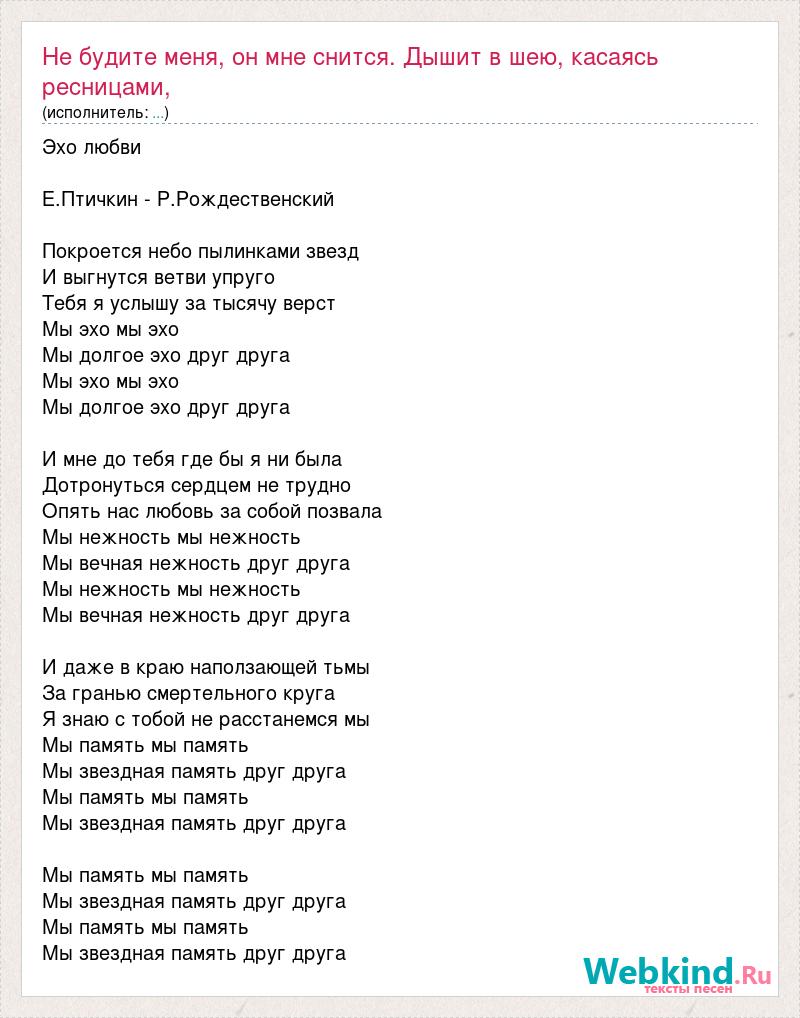 Эхо любви Е.Птичкин - Р.Рождественский Покроется небо пылинками звезд И выгнутся ветви упруго Тебя я услышу за тысячу верст Мы эхо мы эхо Мы долгое эхо друг друга Мы эхо мы эхо Мы долгое эхо друг друга И мне до тебя где бы я ни была Дотронуться сердцем не трудно Опять нас любовь за собой позвала Мы нежность мы нежность Мы вечная нежность друг друга Мы нежность мы нежность Мы вечная нежность друг друга И даже в краю наползающей тьмы За гранью смертельного круга Я знаю с тобой не расстанемся мы Мы память мы память Мы звездная память друг друга Мы память мы память Мы звездная память друг друга Мы память мы память Мы звездная память друг друга Мы память мы память Мы звездная память друг друга