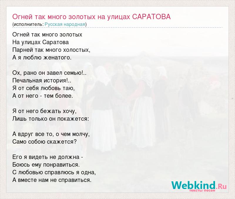 Огней так много золотых На улицах Саратова Парней так много холостых, А я люблю женатого. Ох, рано он завел семью!.. Печальная история!.. Я от себя любовь таю, А от него - тем более. Я от него бежать хочу, Лишь только он покажется: А вдруг все то, о чем молчу, Само собою скажется? Его я видеть не должна - Боюсь ему понравиться. С любовью справлюсь я одна, А вместе нам не справиться.
