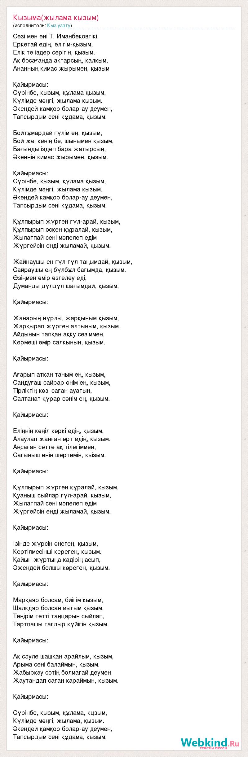 Сөзі мен әні Т. Иманбековтікі. Еркетай едің, елігім-қызым, Елік те іздер серігін, қызым. Ақ босағанда актарсың, қалқым, Анаңның қимас жырымен, қызым Қайырмасы: Сүрінбе, қызым, құлама қызым, Күлімде мәңгі, жылама қызым. Әкеңдей камқор болар-ау деумен, Тапсырдым сені кұдама, қызым. Бойтұмардай гүлім ең, қызым, Бой жеткенің бе, шынымен қызым, Бағынды іздеп бара жатырсың, Әкеңнің қимас жырымен, қызым. Қайырмасы: Сүрінбе, қызым, құлама қызым, Күлімде мәңгі, жылама қызым. Әкеңдей камқор болар-ау деумен, Тапсырдым сені кұдама, қызым. Құлпырып жүрген гүл-арай, қызым, Құлпырып өскен құралай, кызым, Жылатпай сені мәпелеп едім Жүргейсің енді жыламай, қызым. Жайнаушы ең гүл-гүл таңымдай, қызым, Сайраушы ең бүлбұл бағымда, қызым. Өзіңмен өмір өзгелеу еді, Думанды дүлдүл шағымдай, қызым. Қайырмасы: Жанарың нүрлы, жарқыным қызым, Жарқырап жүрген алтыным, қызым. Айдынын тапқан ақку сезіммен, Көрмеші өмір салкынын, қызым. Қайырмасы: Ағарып атқан таным ең, қызым, Сандуғаш сайрар өнім ең, қызым, Тірлікгің көзі саған ауатын, Салтанат қүрар сәнім ең, қызым. Қайырмасы: Еліңнің көңіл көркі едің, қызым, Алаулап жанған өрт едің, қызым. Аңсаған сәтте ақ тілегіммен, Сағыныш әнін шертемін, кьізым. Қайырмасы: Құлпырып жүрген құралай, қызым, Қуаныш сыйлар гүл-арай, кызым, Жылатпай сені мәпелеп едім Жүргейсің енді жыламай, қызым. Қайырмасы: Ізінде жүрсін өнегең, қызым, Кертілмесінші керегең, қызым. Қайын-жүртыңа кадірің асып, Әжеңдей болшы көреген, қызым. Қайырмасы: Марқаяр болсам, биігім кызым, Шалкдяр болсан иығым қызым, Тәңірім төтті таңцарын сыйлап, Тартпашы тағдыр күйігін қызым. Қайырмасы: Ақ сәуле шашқан арайлым, қызым, Арыма сені балаймын, қызым. Жабыркэу сөтің болмағай деумен Жаутандап саған караймын, қызым. Қайырмасы: Сүрінбе, қызым, құлама, кцзым, Күлімде мәңгі, жылама, қызым. Әкендей қамқор болар-ау деумен, Тапсырдым сені құдама, кызым.