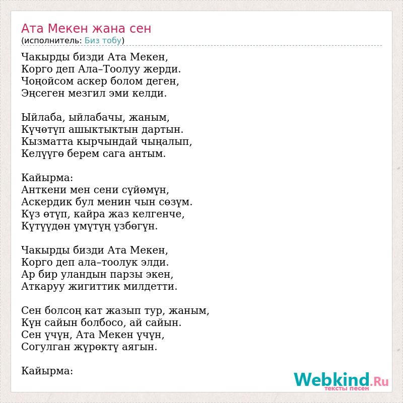 Чакырды бизди Ата Мекен, Корго деп Ала–Тоолуу жерди. Чоңойсом аскер болом деген, Эңсеген мезгил эми келди. Ыйлаба, ыйлабачы, жаным, Күчөтүп ашыктыктын дартын. Кызматта кырчындай чыңалып, Келүүгө берем сага антым. Кайырма: Анткени мен сени сүйөмүн, Аскердик бул менин чын сөзүм. Күз өтүп, кайра жаз келгенче, Күтүүдөн үмүтүң үзбөгүн. Чакырды бизди Ата Мекен, Корго деп ала–тоолук элди. Ар бир уландын парзы экен, Аткаруу жигиттик милдетти. Сен болсоң кат жазып тур, жаным, Күн сайын болбосо, ай сайын. Сен үчүн, Ата Мекен үчүн, Согулган жүрөктү аягын. Кайырма: