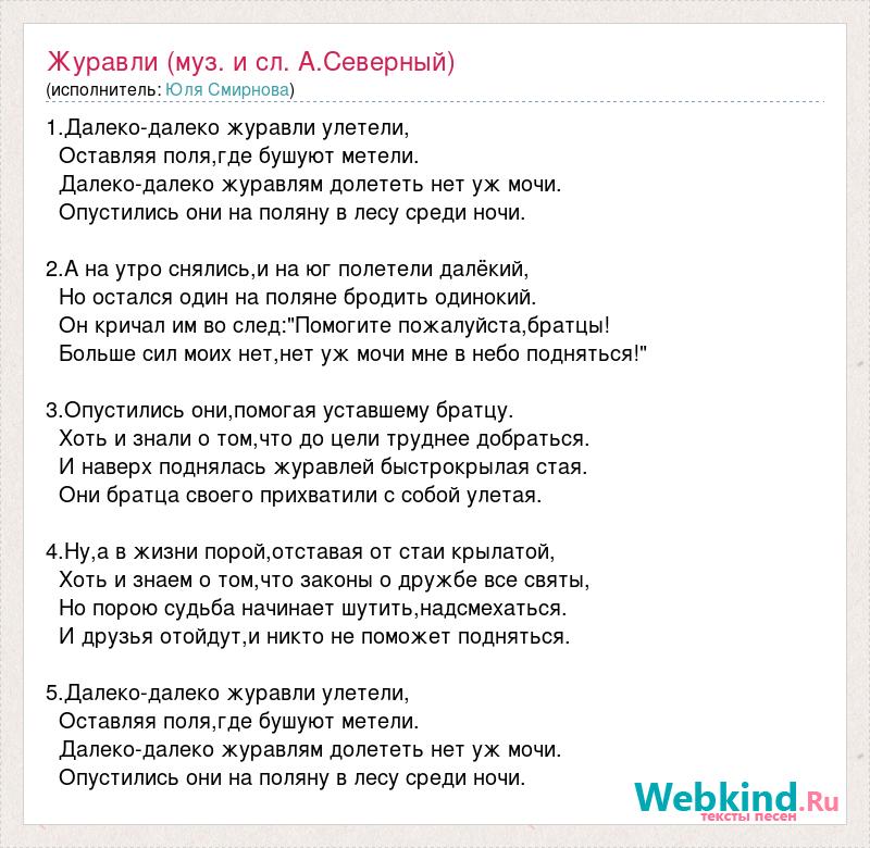 1.Далеко-далеко журавли улетели, Оставляя поля,где бушуют метели. Далеко-далеко журавлям долететь нет уж мочи. Опустились они на поляну в лесу среди ночи. 2.А на утро снялись,и на юг полетели далёкий, Но остался один на поляне бродить одинокий. Он кричал им во след:"Помогите пожалуйста,братцы! Больше сил моих нет,нет уж мочи мне в небо подняться!" 3.Опустились они,помогая уставшему братцу. Хоть и знали о том,что до цели труднее добраться. И наверх поднялась журавлей быстрокрылая стая. Они братца своего прихватили с собой улетая. 4.Ну,а в жизни порой,отставая от стаи крылатой, Хоть и знаем о том,что законы о дружбе все святы, Но порою судьба начинает шутить,надсмехаться. И друзья отойдут,и никто не поможет подняться. 5.Далеко-далеко журавли улетели, Оставляя поля,где бушуют метели. Далеко-далеко журавлям долететь нет уж мочи. Опустились они на поляну в лесу среди ночи.