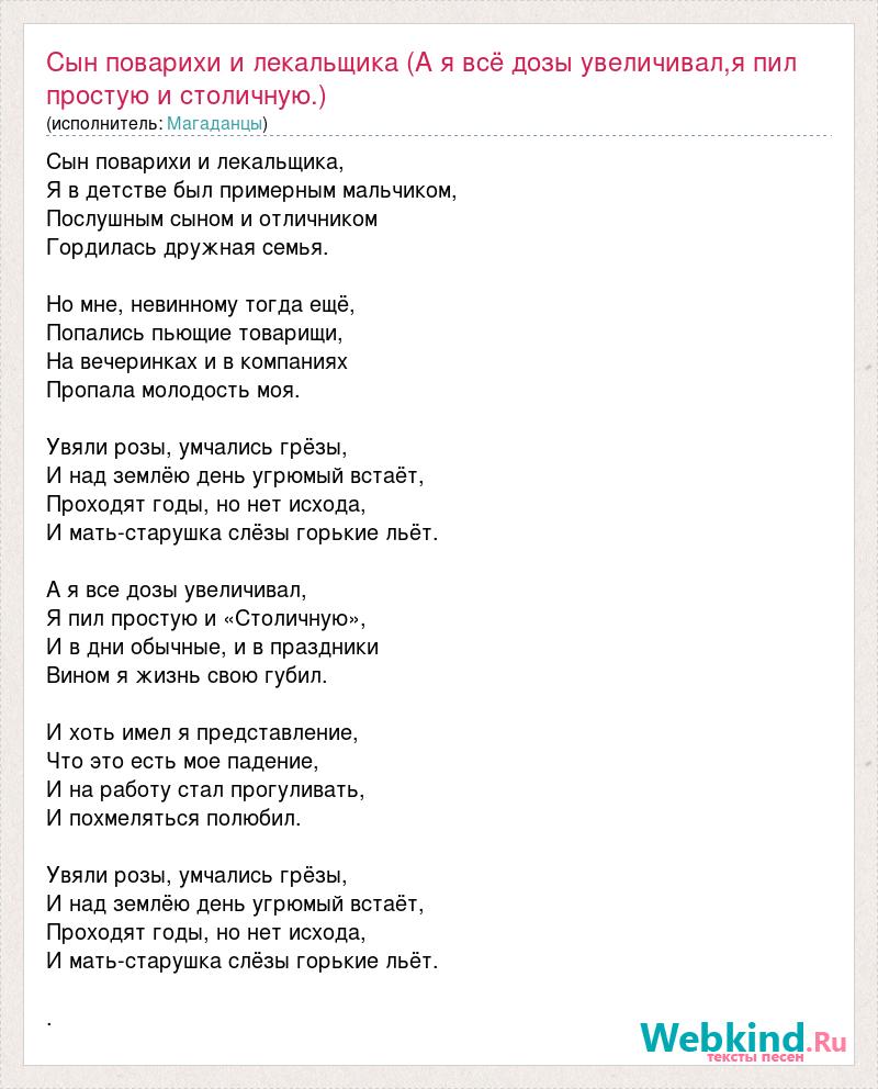 Сын поварихи и лекальщика, Я в детстве был примерным мальчиком, Послушным сыном и отличником Гордилась дружная семья. Но мне, невинному тогда ещё, Попались пьющие товарищи, На вечеринках и в компаниях Пропала молодость моя. Увяли розы, умчались грёзы, И над землёю день угрюмый встаёт, Проходят годы, но нет исхода, И мать-старушка слёзы горькие льёт. А я все дозы увеличивал, Я пил простую и «Столичную», И в дни обычные, и в праздники Вином я жизнь свою губил. И хоть имел я представление, Что это есть мое падение, И на работу стал прогуливать, И похмеляться полюбил. Увяли розы, умчались грёзы, И над землёю день угрюмый встаёт, Проходят годы, но нет исхода, И мать-старушка слёзы горькие льёт. .