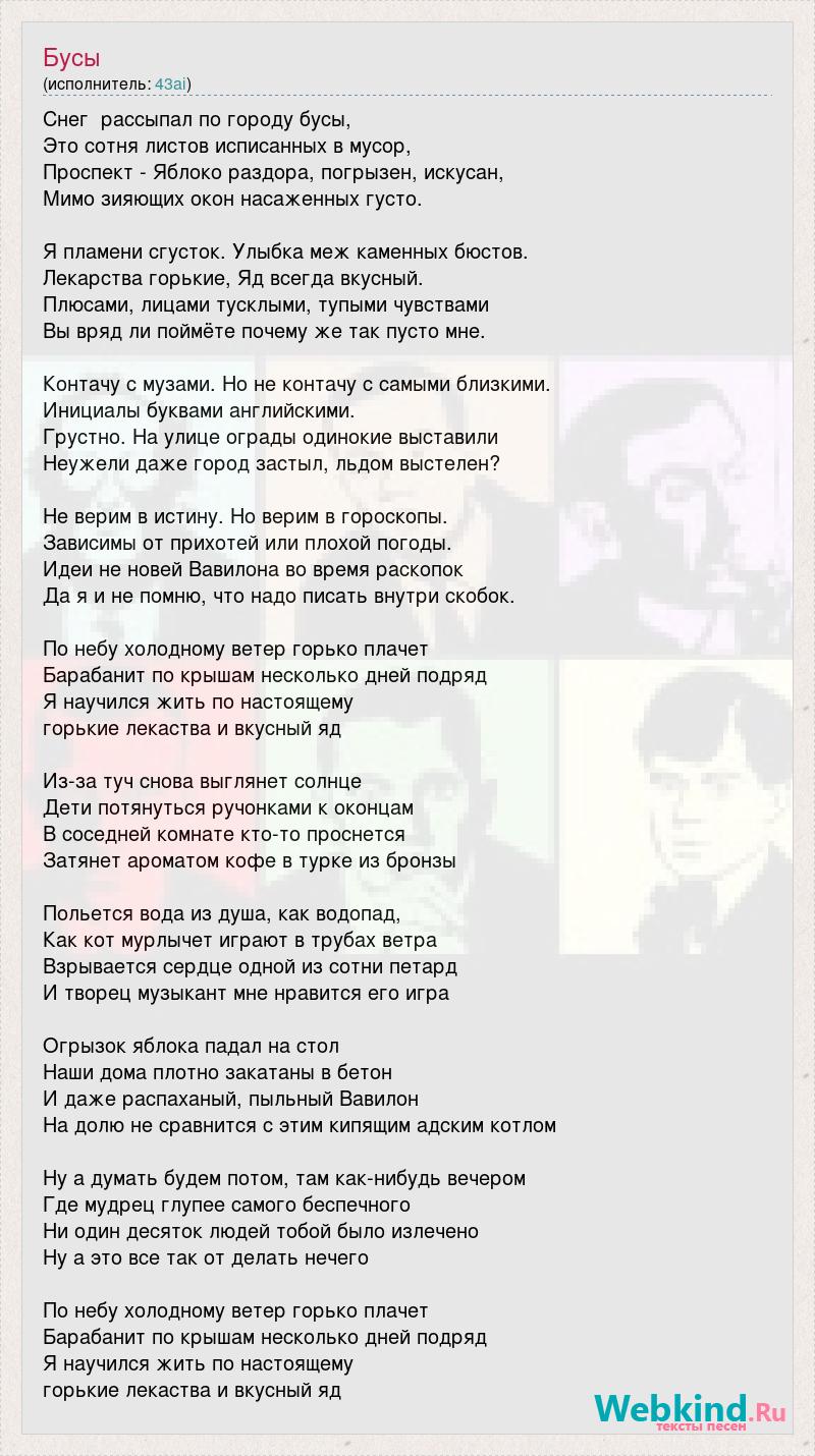 Снег рассыпал по городу бусы, Это сотня листов исписанных в мусор, Проспект - Яблоко раздора, погрызен, искусан, Мимо зияющих окон насаженных густо. Я пламени сгусток. Улыбка меж каменных бюстов. Лекарства горькие, Яд всегда вкусный. Плюсами, лицами тусклыми, тупыми чувствами Вы вряд ли поймёте почему же так пусто мне. Контачу с музами. Но не контачу с самыми близкими. Инициалы буквами английскими. Грустно. На улице ограды одинокие выставили Неужели даже город застыл, льдом выстелен? Не верим в истину. Но верим в гороскопы. Зависимы от прихотей или плохой погоды. Идеи не новей Вавилона во время раскопок Да я и не помню, что надо писать внутри скобок. По небу холодному ветер горько плачет Барабанит по крышам несколько дней подряд Я научился жить по настоящему горькие лекаства и вкусный яд Из-за туч снова выглянет солнце Дети потянуться ручонками к оконцам В соседней комнате кто-то проснется Затянет ароматом кофе в турке из бронзы Польется вода из душа, как водопад, Как кот мурлычет играют в трубах ветра Взрывается сердце одной из сотни петард И творец музыкант мне нравится его игра Огрызок яблока падал на стол Наши дома плотно закатаны в бетон И даже распаханый, пыльный Вавилон На долю не сравнится с этим кипящим адским котлом Ну а думать будем потом, там как-нибудь вечером Где мудрец глупее самого беспечного Ни один десяток людей тобой было излечено Ну а это все так от делать нечего По небу холодному ветер горько плачет Барабанит по крышам несколько дней подряд Я научился жить по настоящему горькие лекаства и вкусный яд