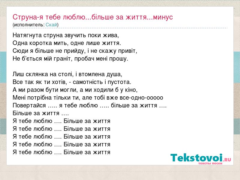 Натягнута струна звучить поки жива, Одна коротка мить, одне лише життя. Сюди я більше не прийду, і не скажу привіт, Не б’ється мій граніт, пробач мені прошу. Лиш склянка на столі, і втомлена душа, Все так як ти хотів, - самотність і пустота. А ми разом бути могли, а ми ходили б у кіно, Мені потрібна тільки ти, але тобі вже все-одно-ооооо Повертайся ….. я тебе люблю ….. більше за життя …. Більше за життя …. Я тебе люблю …. Більше за життя Я тебе люблю …. Більше за життя Я тебе люблю …. Більше за життя Я тебе люблю …. Більше за життя Я тебе люблю …. Більше за життя