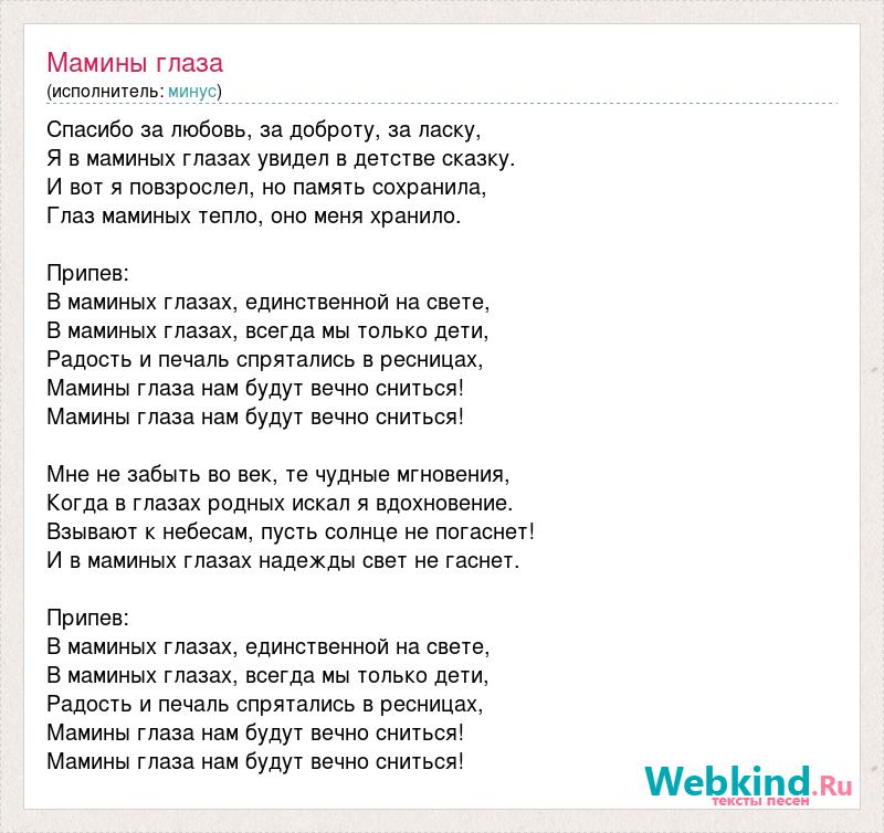 Спасибо за любовь, за доброту, за ласку, Я в маминых глазах увидел в детстве сказку. И вот я повзрослел, но память сохранила, Глаз маминых тепло, оно меня хранило. Припев: В маминых глазах, единственной на свете, В маминых глазах, всегда мы только дети, Радость и печаль спрятались в ресницах, Мамины глаза нам будут вечно сниться! Мамины глаза нам будут вечно сниться! Мне не забыть во век, те чудные мгновения, Когда в глазах родных искал я вдохновение. Взывают к небесам, пусть солнце не погаснет! И в маминых глазах надежды свет не гаснет. Припев: В маминых глазах, единственной на свете, В маминых глазах, всегда мы только дети, Радость и печаль спрятались в ресницах, Мамины глаза нам будут вечно сниться! Мамины глаза нам будут вечно сниться!