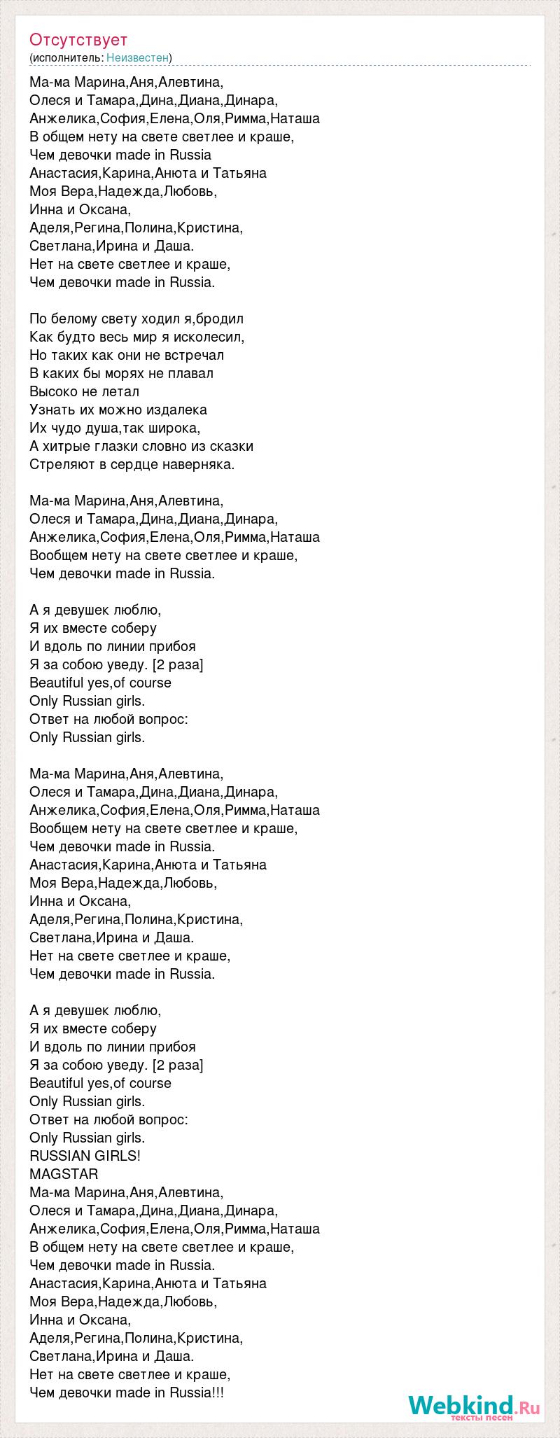 Ма-ма Марина,Аня,Алевтина, Олеся и Тамара,Дина,Диана,Динара, Анжелика,София,Елена,Оля,Римма,Наташа В общем нету на свете светлее и краше, Чем девочки made in Russia Анастасия,Карина,Анюта и Татьяна Моя Вера,Надежда,Любовь, Инна и Оксана, Аделя,Регина,Полина,Кристина, Светлана,Ирина и Даша. Нет на свете светлее и краше, Чем девочки made in Russia. По белому свету ходил я,бродил Как будто весь мир я исколесил, Но таких как они не встречал В каких бы морях не плавал Высоко не летал Узнать их можно издалека Их чудо душа,так широка, А хитрые глазки словно из сказки Стреляют в сердце наверняка. Ма-ма Марина,Аня,Алевтина, Олеся и Тамара,Дина,Диана,Динара, Анжелика,София,Елена,Оля,Римма,Наташа Вообщем нету на свете светлее и краше, Чем девочки made in Russia. А я девушек люблю, Я их вместе соберу И вдоль по линии прибоя Я за собою уведу. [2 раза] Beautiful yes,of course Only Russian girls. Ответ на любой вопрос: Only Russian girls. Ма-ма Марина,Аня,Алевтина, Олеся и Тамара,Дина,Диана,Динара, Анжелика,София,Елена,Оля,Римма,Наташа Вообщем нету на свете светлее и краше, Чем девочки made in Russia. Анастасия,Карина,Анюта и Татьяна Моя Вера,Надежда,Любовь, Инна и Оксана, Аделя,Регина,Полина,Кристина, Светлана,Ирина и Даша. Нет на свете светлее и краше, Чем девочки made in Russia. А я девушек люблю, Я их вместе соберу И вдоль по линии прибоя Я за собою уведу. [2 раза] Beautiful yes,of course Only Russian girls. Ответ на любой вопрос: Only Russian girls. RUSSIAN GIRLS! MAGSTAR Ма-ма Марина,Аня,Алевтина, Олеся и Тамара,Дина,Диана,Динара, Анжелика,София,Елена,Оля,Римма,Наташа В общем нету на свете светлее и краше, Чем девочки made in Russia. Анастасия,Карина,Анюта и Татьяна Моя Вера,Надежда,Любовь, Инна и Оксана, Аделя,Регина,Полина,Кристина, Светлана,Ирина и Даша. Нет на свете светлее и краше, Чем девочки made in Russia!!!