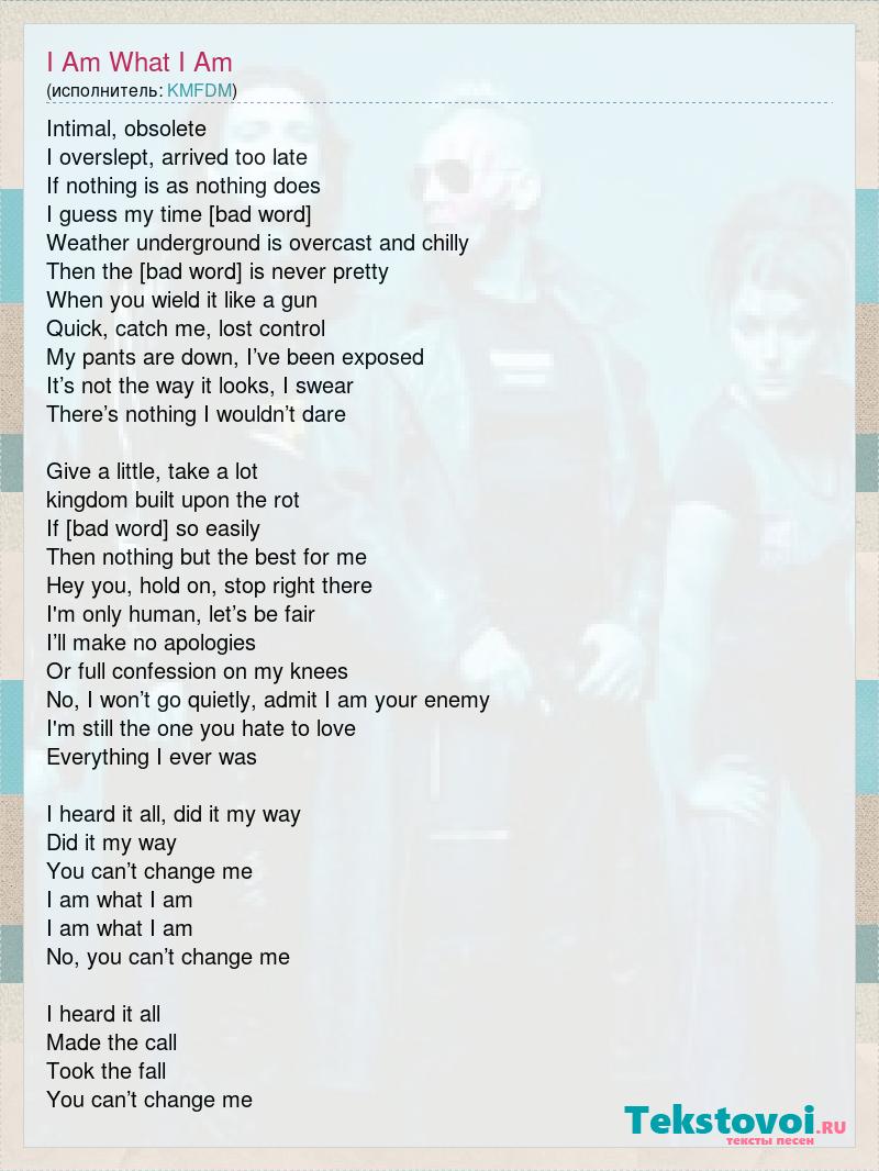Intimal, obsolete I overslept, arrived too late If nothing is as nothing does I guess my time has come Weather underground is overcast and chilly Then the truth is never pretty When you wield it like a gun Quick, catch me, lost control My pants are down, I’ve been exposed It’s not the way it looks, I swear There’s nothing I wouldn’t dare Give a little, take a lot kingdom built upon the rot If power comes so easily Then nothing but the best for me Hey you, hold on, stop right there I'm only human, let’s be fair I’ll make no apologies Or full confession on my knees No, I won’t go quietly, admit I am your enemy I'm still the one you hate to love Everything I ever was I heard it all, did it my way Did it my way You can’t change me I am what I am I am what I am No, you can’t change me I heard it all Made the call Took the fall You can’t change me