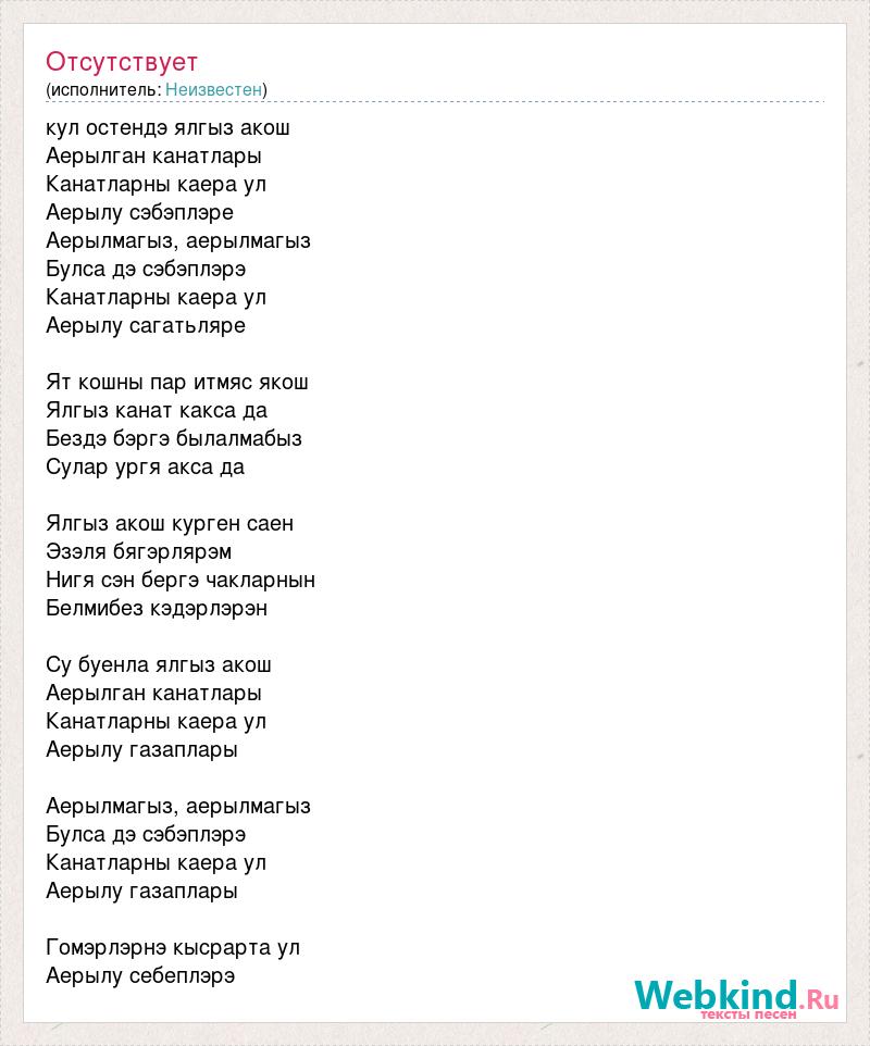 кул остендэ ялгыз акош Аерылган канатлары Канатларны каера ул Аерылу сэбэплэре Аерылмагыз, аерылмагыз Булса дэ сэбэплэрэ Канатларны каера ул Аерылу сагатьляре Ят кошны пар итмяс якош Ялгыз канат какса да Бездэ бэргэ былалмабыз Сулар ургя акса да Ялгыз акош курген саен Эзэля бягэрлярэм Нигя сэн бергэ чакларнын Белмибез кэдэрлэрэн Су буенла ялгыз акош Аерылган канатлары Канатларны каера ул Аерылу газаплары Аерылмагыз, аерылмагыз Булса дэ сэбэплэрэ Канатларны каера ул Аерылу газаплары Гомэрлэрнэ кысрарта ул Аерылу себеплэрэ