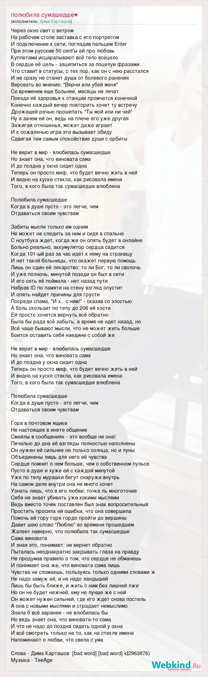Через окно свет с ветром На рабочем столе заставка с его портретом И подключение к сети, погладив пальцем Enter При этом русские 50 cent'ы ей про любовь Куплетами исцарапывают всё тело всецело В сердце её цель - зацепиться за поцелуи фразами Что ставит в статусы, с тех пор, как он с нею расстался И не сразу не станет душа от болевого ранения Веровать во мнение: "Верни или убей меня" Со временем еще больнее, месяцы не лечат Поезда её здоровья к станции промчатся конечной Конечно каждый вечер повторить хочет ту встречу Дрожащей речью прошепать "Ты мой или ни чей" Ну а зачем ей он, ведь на плече его уже другая Зажигая отношенья, может даже играет И к сожаленью игра эта вызывает обиду Сдвигая тем самым спокойствие души с орбиты Не верит в мир - влюбилась сумасшедше Но знает она, что виновата сама И до поздна у окна сидит одна Теперь он просто миф, что будет вечно жить в ней И видно на куске стекла, как рисовала имена Того, в кого была так сумасшедше влюблена Полюбила сумасшедше Когда в душе пусто - это легче, чем Отдаваться своим чувствам Забиты мысли только им одним Не может не следить за ним и сидя в спальне С ноутбука ждет, когда же он опять будет в онлайне Больно реально, аккумулятор сердца садится Когда 101-ый раз за час идет к нему на страницу И нет такой больницы, что окажет первую помощь Лишь он один её лекарство: то ли Бог, то ли сволочь И уже полночь, минутой позади он был в сети И его сеть её поймала - нет назад пути Набрав ID по памяти на стену взгляд опустит И опять найдет причины для грусти Посреди спама, "И х.. с ним!" - сказав со злостью А боль скользит по телу до 206 её кости Ей просто хочется вернуть всё обратно Была бы рада всё забыть, а время не идет назад, но Всё чаще бывают мысли, что не может жить больше Боится оставить себя наедине с собой же Не верит в мир - влюбилась сумасшедше Но знает она, что виновата сама И до поздна у окна сидит одна Теперь он просто миф, что будет вечно жить в ней И видно на куске стекла, как рисовала имена Того, в кого была так сумасшедше влюблена Полюбила сумасшедше Когда в душе пусто - это легче, чем Отдаваться своим чувствам Гора в почтовом ящике Не настоящее в инете общение Смайлы в сообщениях - это вообще не она! Печалью до дна её взгляды полностью наполнены Он нужен ей сильнее не только солнца, но и луны Объединены лишь для него её чувства Сердце помнит о нем больше, чем о собственном пульсе Пусто в душе и хуже ей с каждой минутой Уже по телу мурашки бегут снаружи внутрь На самом деле внутри она не много хочет Узнать лишь, что в его любви: точка ль многоточие Себя не знает убивать уже какими мыслями Ведь вместо точек поставлен был знак вопросительный Простить просила ей ошибки, что она совершила Помочь ей гору горя гордо пройти до вершины Давит шею слово "Люблю" во времени прошедшем Жалеет наверно, что полюбила так сумасшедше Сама виновата И зная это, понимает: не вернет обратно Пыталась неоднакратно закрывать глаза на правду Не продумав правило о том, что сердце не обманешь И понимает она же, что виновата сама лишь Чувства не сломаешь, пользуясь только одними словами ж Не надо замуж ей, и не надо ландышей Лишь бы быть ближе, и жить с ним без лишней лжи Но он не будет нежней, ему не лучше же с ней Он может нужен сильней, где его ждет снова постель А она с новыми мыслями и страдает немыслимо Знала б всё заранее - не влюбилась бы Но ве