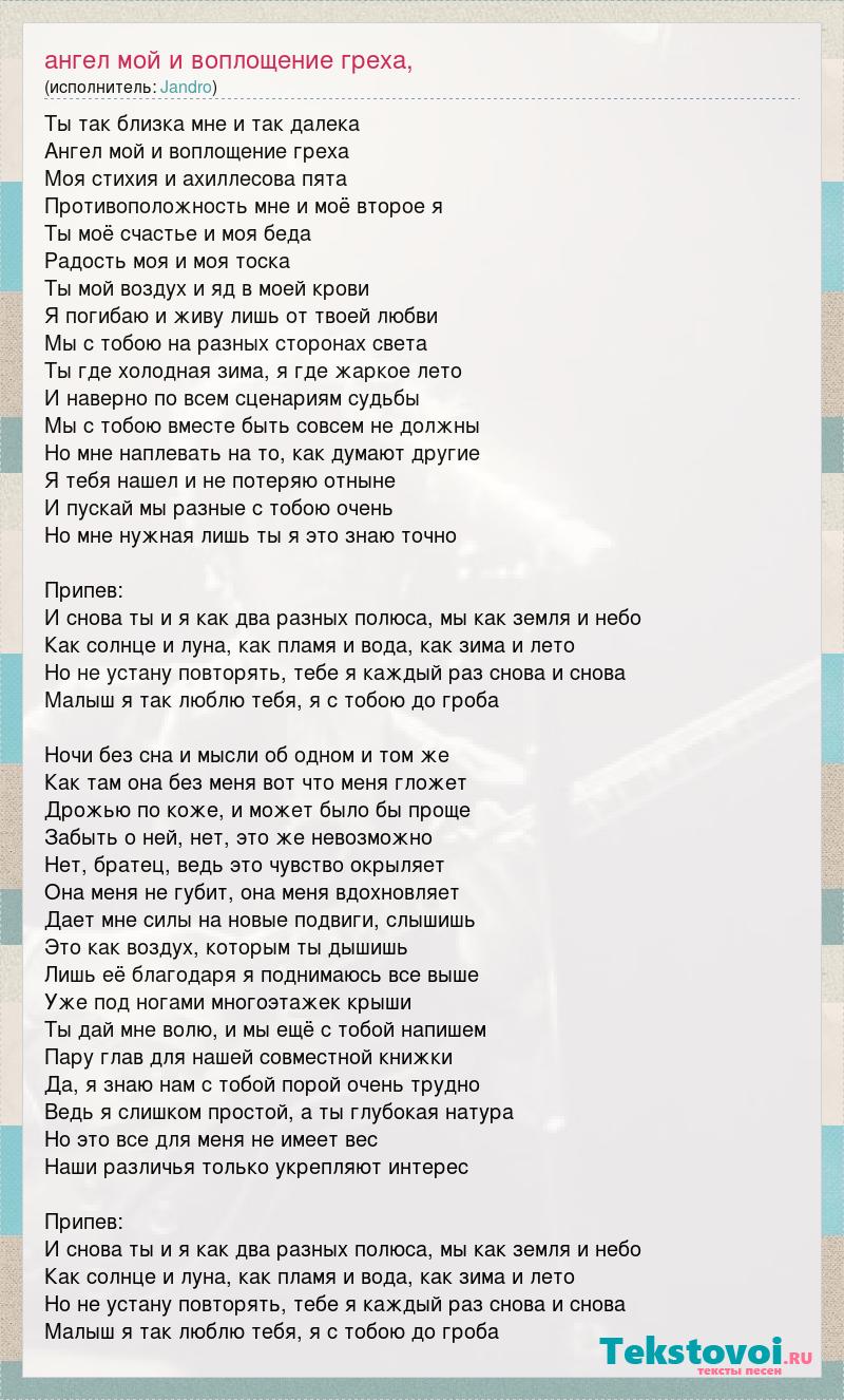 Ты так близка мне и так далека Ангел мой и воплощение греха Моя стихия и ахиллесова пята Противоположность мне и моё второе я Ты моё счастье и моя беда Радость моя и моя тоска Ты мой воздух и яд в моей крови Я погибаю и живу лишь от твоей любви Мы с тобою на разных сторонах света Ты где холодная зима, я где жаркое лето И наверно по всем сценариям судьбы Мы с тобою вместе быть совсем не должны Но мне наплевать на то, как думают другие Я тебя нашел и не потеряю отныне И пускай мы разные с тобою очень Но мне нужная лишь ты я это знаю точно Припев: И снова ты и я как два разных полюса, мы как земля и небо Как солнце и луна, как пламя и вода, как зима и лето Но не устану повторять, тебе я каждый раз снова и снова Малыш я так люблю тебя, я с тобою до гроба Ночи без сна и мысли об одном и том же Как там она без меня вот что меня гложет Дрожью по коже, и может было бы проще Забыть о ней, нет, это же невозможно Нет, братец, ведь это чувство окрыляет Она меня не губит, она меня вдохновляет Дает мне силы на новые подвиги, слышишь Это как воздух, которым ты дышишь Лишь её благодаря я поднимаюсь все выше Уже под ногами многоэтажек крыши Ты дай мне волю, и мы ещё с тобой напишем Пару глав для нашей совместной книжки Да, я знаю нам с тобой порой очень трудно Ведь я слишком простой, а ты глубокая натура Но это все для меня не имеет вес Наши различья только укрепляют интерес Припев: И снова ты и я как два разных полюса, мы как земля и небо Как солнце и луна, как пламя и вода, как зима и лето Но не устану повторять, тебе я каждый раз снова и снова Малыш я так люблю тебя, я с тобою до гроба