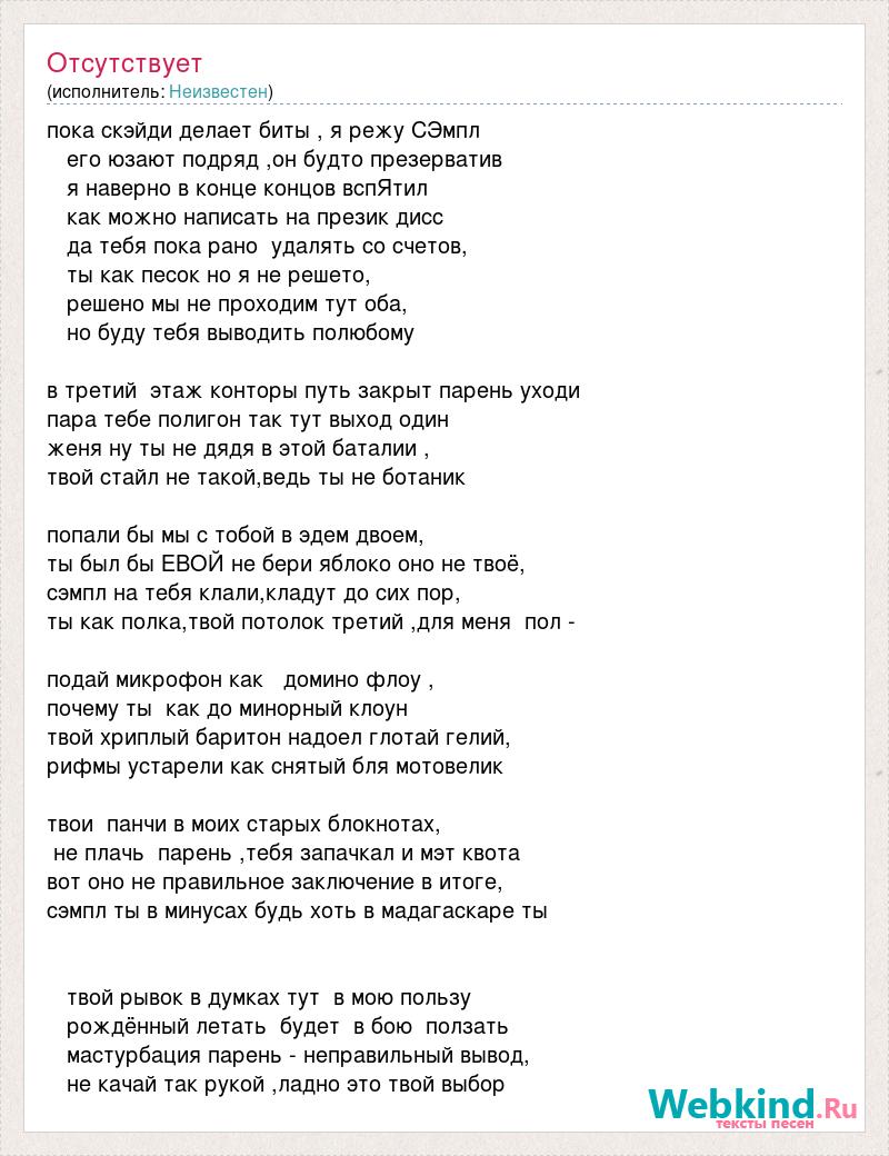 пока скэйди делает биты , я режу СЭмпл его юзают подряд ,он будто презерватив я наверно в конце концов вспЯтил как можно написать на презик дисс да тебя пока рано удалять со счетов, ты как песок но я не решето, решено мы не проходим тут оба, но буду тебя выводить полюбому в третий этаж конторы путь закрыт парень уходи пара тебе полигон так тут выход один женя ну ты не дядя в этой баталии , твой стайл не такой,ведь ты не ботаник попали бы мы с тобой в эдем двоем, ты был бы ЕВОЙ не бери яблоко оно не твоё, сэмпл на тебя клали,кладут до сих пор, ты как полка,твой потолок третий ,для меня пол - подай микрофон как домино флоу , почему ты как до минорный клоун твой хриплый баритон надоел глотай гелий, рифмы устарели как снятый бля мотовелик твои панчи в моих старых блокнотах, не плачь парень ,тебя запачкал и мэт квота вот оно не правильное заключение в итоге, сэмпл ты в минусах будь хоть в мадагаскаре ты твой рывок в думках тут в мою пользу рождённый летать будет в бою ползать мастурбация парень - неправильный вывод, не качай так рукой ,ладно это твой выбор