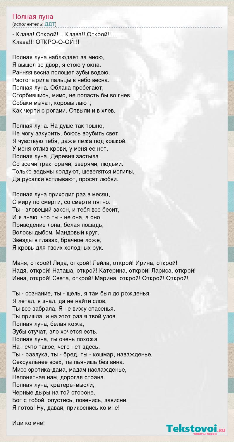 - Клава! Открой!... Клава!! Открой!!... Клава!!! ОТКРО-О-ОЙ!!! Полная луна наблюдает за мною, Я вышел во двор, я стою у окна. Ранняя весна полощет зубы водою, Растопырила пальцы в небо весна. Полная луна. Облака пробегают, Сгорбившись, мимо, не попасть бы во гнев. Собаки мычат, коровы лают, Как черти с рогами. Отвыли и в хлев. Полная луна. На душе так тошно, Не могу закурить, боюсь врубить свет. Я чувствую тебя, даже лежа под кошкой. У меня отлив крови, у меня ее нет. Полная луна. Деревня застыла Со всеми тракторами, зверями, людьми. Только ведьмы колдуют, шевелятся могилы, Да русалки всплывают, просят любви. Полная луна приходит раз в месяц, С миру по смерти, со смерти пятно. Ты - зловещий закон, и тебя все бесит, И я знаю, что ты - не она, а оно. Приведение лона, белая лошадь, Волосы дыбом. Мандовый круг. Звезды в глазах, брачное ложе, Я кровь для твоих холодных рук. Маня, открой! Лида, открой! Лейла, открой! Ирина, открой! Надя, открой! Наташа, открой! Катерина, открой! Лариса, открой! Инна, открой! Света, открой! Марина, открой! Открой! Открой! Ты - сознание, ты - щель, я там был до рожденья. Я летал, я знал, да не найти слов. Ты все забрала. Я не вижу спасенья. Ты пришла, и на этот раз я твой улов. Полная луна, белая кожа, Зубы стучат, зло хочется есть. Полная луна, ты очень похожа На нечто такое, чего нет здесь. Ты - разлука, ты - бред, ты - кошмар, наважденье, Сексуальнее всех, ты пьянишь без вина. Мисс эротика-дама, мадам наслажденье, Непонятная нам, дорогая страна. Полная луна, кратеры-мысли, Черные дыры на той стороне. Бог с тобой, опустись, повенись, зависни, Я готов! Ну, давай, прикоснись ко мне! Иди ко мне!