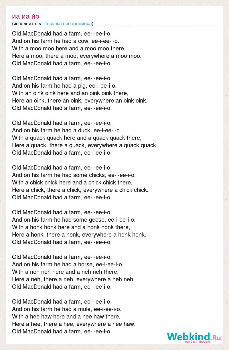 Old MacDonald had a farm, ee-i-ee-i-o, And on his farm he had a cow, ee-i-ee-i-o. With a moo moo here and a moo moo there, Here a moo, there a moo, everywhere a moo moo. Old MacDonald had a farm, ee-i-ee-i-o. Old MacDonald had a farm, ee-i-ee-i-o, And on his farm he had a pig, ee-i-ee-i-o. With an oink oink here and an oink oink there, Here an oink, there an oink, everywhere an oink oink. Old MacDonald had a farm, ee-i-ee-i-o. Old MacDonald had a farm, ee-i-ee-i-o, And on his farm he had a duck, ee-i-ee-i-o. With a quack quack here and a quack quack there, Here a quack, there a quack, everywhere a quack quack. Old MacDonald had a farm, ee-i-ee-i-o. Old MacDonald had a farm, ee-i-ee-i-o, And on his farm he had some chicks, ee-i-ee-i-o. With a chick chick here and a chick chick there, Here a chick, there a chick, everywhere a chick chick. Old MacDonald had a farm, ee-i-ee-i-o. Old MacDonald had a farm, ee-i-ee-i-o, And on his farm he had some geese, ee-i-ee-i-o. With a honk honk here and a honk honk there, Here a honk, there a honk, everywhere a honk honk. Old MacDonald had a farm, ee-i-ee-i-o. Old MacDonald had a farm, ee-i-ee-i-o, And on his farm he had a horse, ee-i-ee-i-o. With a neh neh here and a neh neh there, Here a neh, there a neh, everywhere a neh neh. Old MacDonald had a farm, ee-i-ee-i-o. Old MacDonald had a farm, ee-i-ee-i-o, And on his farm he had a mule, ee-i-ee-i-o. With a hee haw here and a hee haw there, Here a hee, there a hee, everywhere a hee haw. Old MacDonald had a farm, ee-i-ee-i-o.