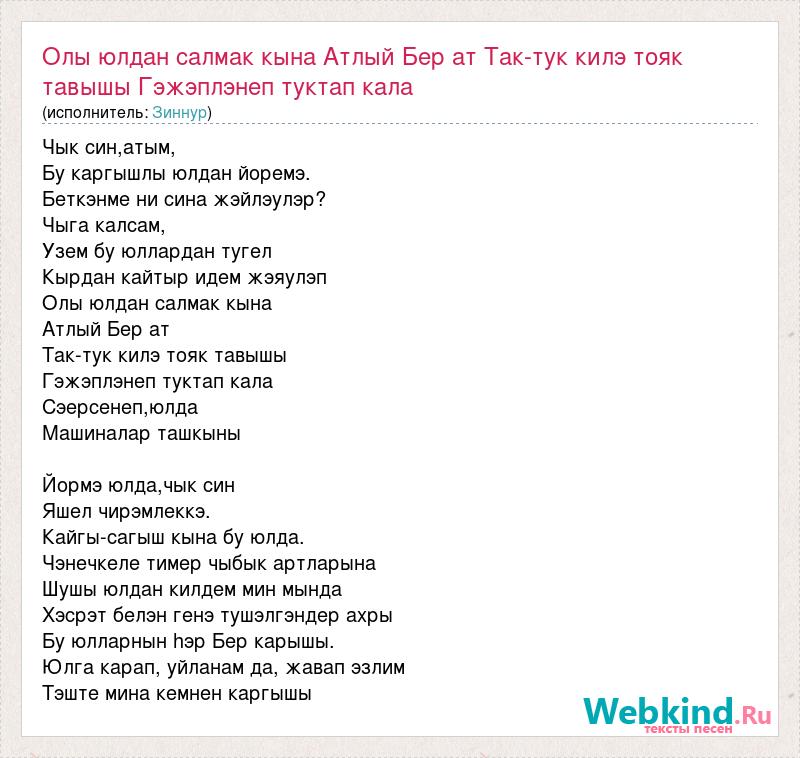Чык син,атым, Бу каргышлы юлдан йоремэ. Беткэнме ни сина жэйлэулэр? Чыга калсам, Узем бу юллардан тугел Кырдан кайтыр идем жэяулэп Олы юлдан салмак кына Атлый Бер ат Так-тук килэ тояк тавышы Гэжэплэнеп туктап кала Сэерсенеп,юлда Машиналар ташкыны Йормэ юлда,чык син Яшел чирэмлеккэ. Кайгы-сагыш кына бу юлда. Чэнечкеле тимер чыбык артларына Шушы юлдан килдем мин мында Хэсрэт белэн генэ тушэлгэндер ахры Бу юлларнын hэр Бер карышы. Юлга карап, уйланам да, жавап эзлим Тэште мина кемнен каргышы