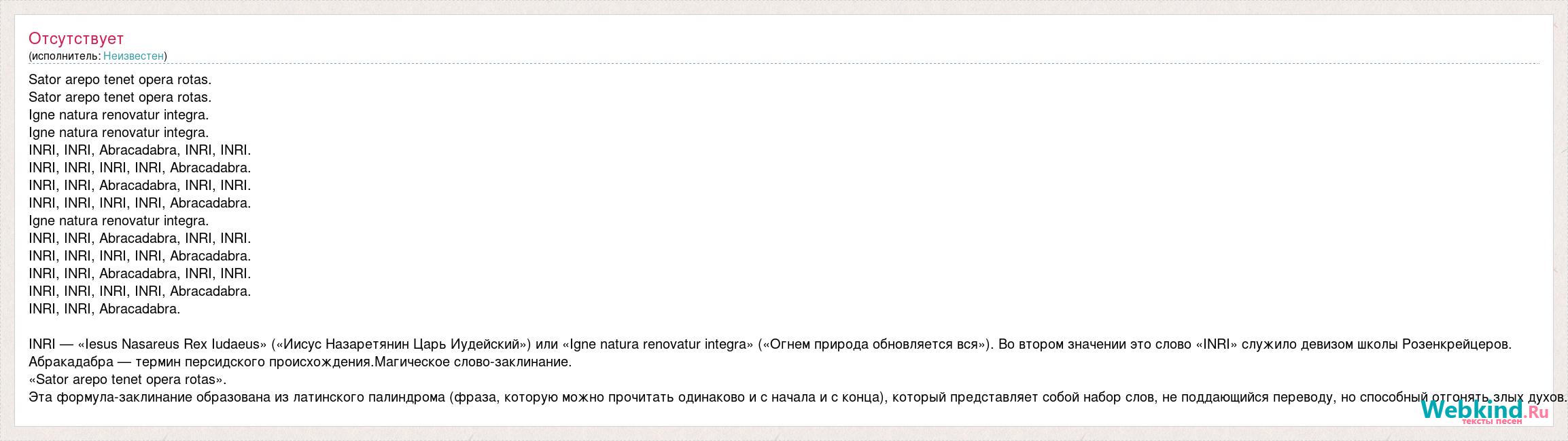 Sator arepo tenet opera rotas. Sator arepo tenet opera rotas. Igne natura renovatur integra. Igne natura renovatur integra. INRI, INRI, Abracadabra, INRI, INRI. INRI, INRI, INRI, INRI, Abracadabra. INRI, INRI, Abracadabra, INRI, INRI. INRI, INRI, INRI, INRI, Abracadabra. Igne natura renovatur integra. INRI, INRI, Abracadabra, INRI, INRI. INRI, INRI, INRI, INRI, Abracadabra. INRI, INRI, Abracadabra, INRI, INRI. INRI, INRI, INRI, INRI, Abracadabra. INRI, INRI, Abracadabra. INRI — «Iesus Nasareus Rex Iudaeus» («Иисус Назаретянин Царь Иудейский») или «Igne natura renovatur integra» («Огнем природа обновляется вся»). Во втором значении это слово «INRI» служило девизом школы Розенкрейцеров. Абракадабра — термин персидского происхождения.Магическое слово-заклинание. «Sator arepo tenet opera rotas». Эта формула-заклинание образована из латинского палиндрома (фраза, которую можно прочитать одинаково и с начала и с конца), который представляет собой набор слов, не поддающийся переводу, но способный отгонять злых духов.