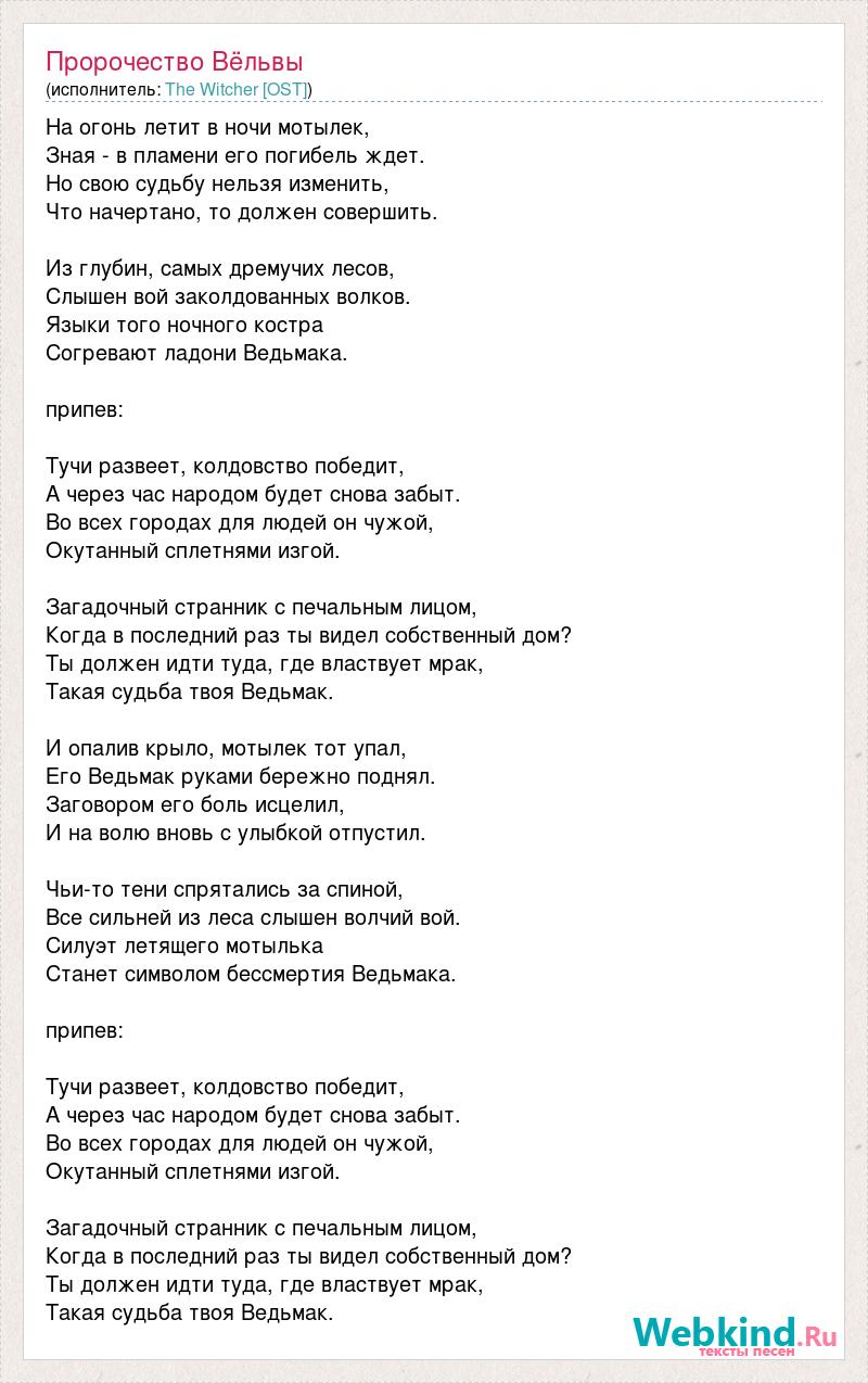 На огонь летит в ночи мотылек, Зная - в пламени его погибель ждет. Но свою судьбу нельзя изменить, Что начертано, то должен совершить. Из глубин, самых дремучих лесов, Слышен вой заколдованных волков. Языки того ночного костра Согревают ладони Ведьмака. припев: Тучи развеет, колдовство победит, А через час народом будет снова забыт. Во всех городах для людей он чужой, Окутанный сплетнями изгой. Загадочный странник с печальным лицом, Когда в последний раз ты видел собственный дом? Ты должен идти туда, где властвует мрак, Такая судьба твоя Ведьмак. И опалив крыло, мотылек тот упал, Его Ведьмак руками бережно поднял. Заговором его боль исцелил, И на волю вновь с улыбкой отпустил. Чьи-то тени спрятались за спиной, Все сильней из леса слышен волчий вой. Силуэт летящего мотылька Станет символом бессмертия Ведьмака. припев: Тучи развеет, колдовство победит, А через час народом будет снова забыт. Во всех городах для людей он чужой, Окутанный сплетнями изгой. Загадочный странник с печальным лицом, Когда в последний раз ты видел собственный дом? Ты должен идти туда, где властвует мрак, Такая судьба твоя Ведьмак.