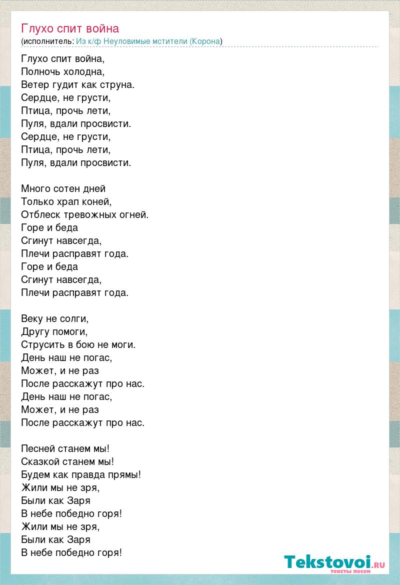 Глухо спит война, Полночь холодна, Ветер гудит как струна. Сердце, не грусти, Птица, прочь лети, Пуля, вдали просвисти. Сердце, не грусти, Птица, прочь лети, Пуля, вдали просвисти. Много сотен дней Только храп коней, Отблеск тревожных огней. Горе и беда Сгинут навсегда, Плечи расправят года. Горе и беда Сгинут навсегда, Плечи расправят года. Веку не солги, Другу помоги, Струсить в бою не моги. День наш не погас, Может, и не раз После расскажут про нас. День наш не погас, Может, и не раз После расскажут про нас. Песней станем мы! Сказкой станем мы! Будем как правда прямы! Жили мы не зря, Были как Заря В небе победно горя! Жили мы не зря, Были как Заря В небе победно горя!