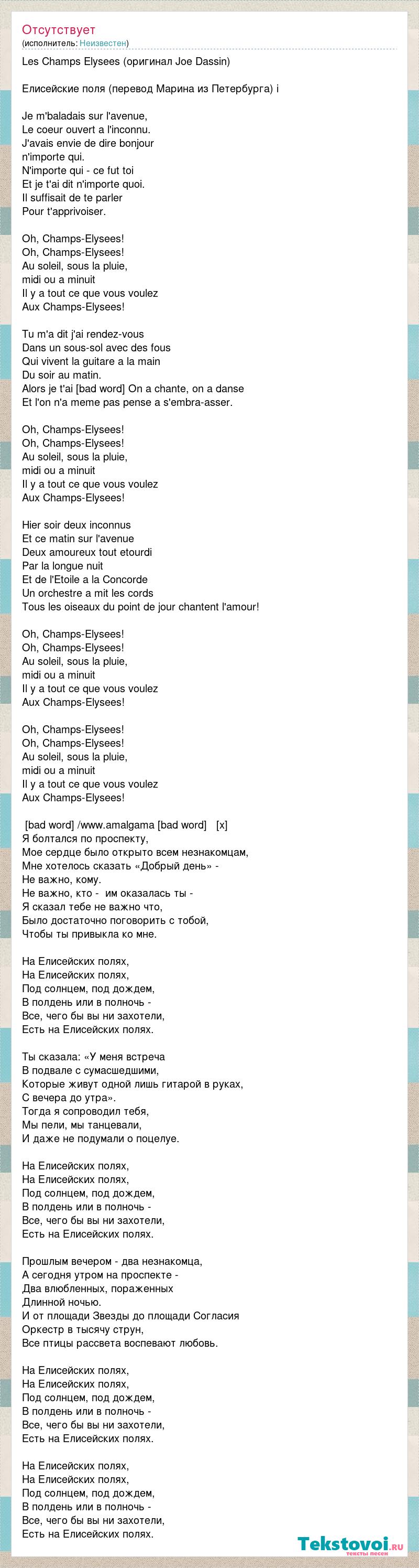 Les Champs Elysees (оригинал Joe Dassin) Елисейские поля (перевод Марина из Петербурга) i Je m'baladais sur l'avenue, Le coeur ouvert a l'inconnu. J'avais envie de dire bonjour n'importe qui. N'importe qui - ce fut toi Et je t'ai dit n'importe quoi. Il suffisait de te parler Pour t'apprivoiser. Oh, Champs-Elysees! Oh, Champs-Elysees! Au soleil, sous la pluie, midi ou a minuit Il y a tout ce que vous voulez Aux Champs-Elysees! Tu m'a dit j'ai rendez-vous Dans un sous-sol avec des fous Qui vivent la guitare a la main Du soir au matin. Alors je t'ai accompagne On a chante, on a danse Et l'on n'a meme pas pense a s'embra-asser. Oh, Champs-Elysees! Oh, Champs-Elysees! Au soleil, sous la pluie, midi ou a minuit Il y a tout ce que vous voulez Aux Champs-Elysees! Hier soir deux inconnus Et ce matin sur l'avenue Deux amoureux tout etourdi Par la longue nuit Et de l'Etoile a la Concorde Un orchestre a mit les cords Tous les oiseaux du point de jour chantent l'amour! Oh, Champs-Elysees! Oh, Champs-Elysees! Au soleil, sous la pluie, midi ou a minuit Il y a tout ce que vous voulez Aux Champs-Elysees! Oh, Champs-Elysees! Oh, Champs-Elysees! Au soleil, sous la pluie, midi ou a minuit Il y a tout ce que vous voulez Aux Champs-Elysees! [bad word] /www.amalgama [bad word] [x] Я болтался по проспекту, Мое сердце было открыто всем незнакомцам, Мне хотелось сказать «Добрый день» - Не важно, кому. Не важно, кто - им оказалась ты - Я сказал тебе не важно что, Было достаточно поговорить с тобой, Чтобы ты привыкла ко мне. На Елисейских полях, На Елисейских полях, Под солнцем, под дождем, В полдень или в полночь - Все, чего бы вы ни захотели, Есть на Елисейских полях. Ты сказала: «У меня встреча В подвале с сумасшедшими, Которые живут одной лишь гитарой в руках, С вечера до утра». Тогда я сопроводил тебя, Мы пели, мы танцевали, И даже не подумали о поцелуе. На Елисейских полях, На Елисейских полях, Под солнцем, под дождем, В полдень или в полночь - Все, чего бы вы ни захотели, Есть на Елисейских полях. Прошлым вечером - два незнакомца, А сегодня утром на проспекте - Два влюбленных, пораженных Длинной ночью. И от площади Звезды до площади Согласия Оркестр в тысячу струн, Все птицы рассвета воспевают любовь. На Елисейских полях, На Елисейских полях, Под солнцем, под дождем, В полдень или в полночь - Все, чего бы вы ни захотели, Есть на Елисейских полях. На Елисейских полях, На Елисейских полях, Под солнцем, под дождем, В полдень или в полночь - Все, чего бы вы ни захотели, Есть на Елисейских полях.