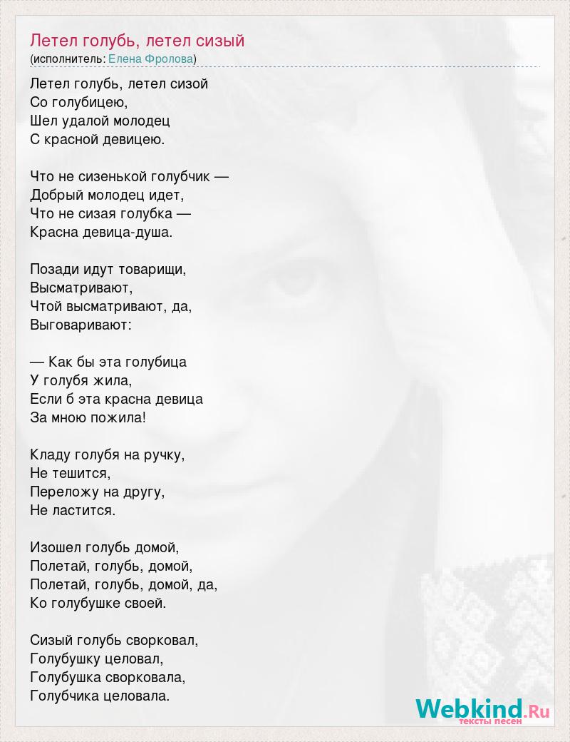 Летел голубь, летел сизой Со голубицею, Шел удалой молодец С красной девицею. Что не сизенькой голубчик — Добрый молодец идет, Что не сизая голубка — Красна девица-душа. Позади идут товарищи, Высматривают, Чтой высматривают, да, Выговаривают: — Как бы эта голубица У голубя жила, Если б эта красна девица За мною пожила! Кладу голубя на ручку, Не тешится, Переложу на другу, Не ластится. Изошел голубь домой, Полетай, голубь, домой, Полетай, голубь, домой, да, Ко голубушке своей. Сизый голубь сворковал, Голубушку целовал, Голубушка сворковала, Голубчика целовала.