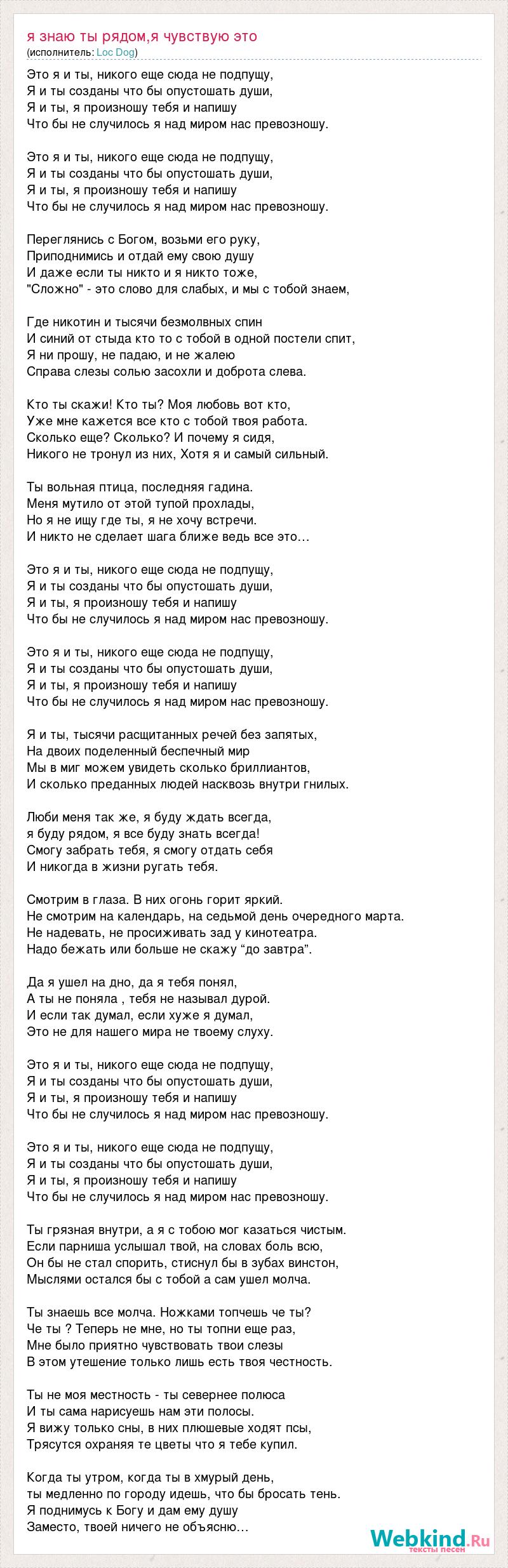 Это я и ты, никого еще сюда не подпущу, Я и ты созданы что бы опустошать души, Я и ты, я произношу тебя и напишу Что бы не случилось я над миром нас превозношу. Это я и ты, никого еще сюда не подпущу, Я и ты созданы что бы опустошать души, Я и ты, я произношу тебя и напишу Что бы не случилось я над миром нас превозношу. Переглянись с Богом, возьми его руку, Приподнимись и отдай ему свою душу И даже если ты никто и я никто тоже, "Сложно" - это слово для слабых, и мы с тобой знаем, Где никотин и тысячи безмолвных спин И синий от стыда кто то с тобой в одной постели спит, Я ни прошу, не падаю, и не жалею Справа слезы солью засохли и доброта слева. Кто ты скажи! Кто ты? Моя любовь вот кто, Уже мне кажется все кто с тобой твоя работа. Сколько еще? Сколько? И почему я сидя, Никого не тронул из них, Хотя я и самый сильный. Ты вольная птица, последняя гадина. Меня мутило от этой тупой прохлады, Но я не ищу где ты, я не хочу встречи. И никто не сделает шага ближе ведь все это… Это я и ты, никого еще сюда не подпущу, Я и ты созданы что бы опустошать души, Я и ты, я произношу тебя и напишу Что бы не случилось я над миром нас превозношу. Это я и ты, никого еще сюда не подпущу, Я и ты созданы что бы опустошать души, Я и ты, я произношу тебя и напишу Что бы не случилось я над миром нас превозношу. Я и ты, тысячи расщитанных речей без запятых, На двоих поделенный беспечный мир Мы в миг можем увидеть сколько бриллиантов, И сколько преданных людей насквозь внутри гнилых. Люби меня так же, я буду ждать всегда, я буду рядом, я все буду знать всегда! Смогу забрать тебя, я смогу отдать себя И никогда в жизни ругать тебя. Смотрим в глаза. В них огонь горит яркий. Не смотрим на календарь, на седьмой день очередного марта. Не надевать, не просиживать зад у кинотеатра. Надо бежать или больше не скажу “до завтра”. Да я ушел на дно, да я тебя понял, А ты не поняла , тебя не называл дурой. И если так думал, если хуже я думал, Это не для нашего мира не твоему слуху. Это я и ты, никого еще сюда не подпущу, Я и ты созданы что бы опустошать души, Я и ты, я произношу тебя и напишу Что бы не случилось я над миром нас превозношу. Это я и ты, никого еще сюда не подпущу, Я и ты созданы что бы опустошать души, Я и ты, я произношу тебя и напишу Что бы не случилось я над миром нас превозношу. Ты грязная внутри, а я с тобою мог казаться чистым. Если парниша услышал твой, на словах боль всю, Он бы не стал спорить, стиснул бы в зубах винстон, Мыслями остался бы с тобой а сам ушел молча. Ты знаешь все молча. Ножками топчешь че ты? Че ты ? Теперь не мне, но ты топни еще раз, Мне было приятно чувствовать твои слезы В этом утешение только лишь есть твоя честность. Ты не моя местность - ты севернее полюса И ты сама нарисуешь нам эти полосы. Я вижу только сны, в них плюшевые ходят псы, Трясутся охраняя те цветы что я тебе купил. Когда ты утром, когда ты в хмурый день, ты медленно по городу идешь, что бы бросать тень. Я поднимусь к Богу и дам ему душу Заместо, твоей ничего не объясню…