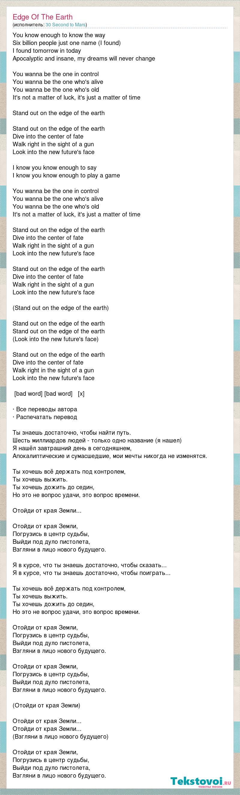 You know enough to know the way Six billion people just one name (I found) I found tomorrow in today Apocalyptic and insane, my dreams will never change You wanna be the one in control You wanna be the one who's alive You wanna be the one who's old It's not a matter of luck, it's just a matter of time Stand out on the edge of the earth Stand out on the edge of the earth Dive into the center of fate Walk right in the sight of a gun Look into the new future's face I know you know enough to say I know you know enough to play a game You wanna be the one in control You wanna be the one who's alive You wanna be the one who's old It's not a matter of luck, it's just a matter of time Stand out on the edge of the earth Dive into the center of fate Walk right in the sight of a gun Look into the new future's face Stand out on the edge of the earth Dive into the center of fate Walk right in the sight of a gun Look into the new future's face (Stand out on the edge of the earth) Stand out on the edge of the earth Stand out on the edge of the earth (Look into the new future's face) Stand out on the edge of the earth Dive into the center of fate Walk right in the sight of a gun Look into the new future's face [bad word] [bad word] [x] · Все переводы автора · Распечатать перевод Ты знаешь достаточно, чтобы найти путь. Шесть миллиардов людей - только одно название (я нашел) Я нашёл завтрашний день в сегодняшнем, Апокалиптические и сумасшедшие, мои мечты никогда не изменятся. Ты хочешь всё держать под контролем, Ты хочешь выжить. Ты хочешь дожить до седин, Но это не вопрос удачи, это вопрос времени. Отойди от края Земли... Отойди от края Земли, Погрузись в центр судьбы, Выйди под дуло пистолета, Взгляни в лицо нового будущего. Я в курсе, что ты знаешь достаточно, чтобы сказать... Я в курсе, что ты знаешь достаточно, чтобы поиграть... Ты хочешь всё держать под контролем, Ты хочешь выжить. Ты хочешь дожить до седин, Но это не вопрос удачи, это вопрос времени. Отойди от края Земли, Погрузись в центр судьбы, Выйди под дуло пистолета, Взгляни в лицо нового будущего. Отойди от края Земли, Погрузись в центр судьбы, Выйди под дуло пистолета, Взгляни в лицо нового будущего. (Отойди от края Земли) Отойди от края Земли... Отойди от края Земли... (Взгляни в лицо нового будущего) Отойди от края Земли, Погрузись в центр судьбы, Выйди под дуло пистолета, Взгляни в лицо нового будущего.