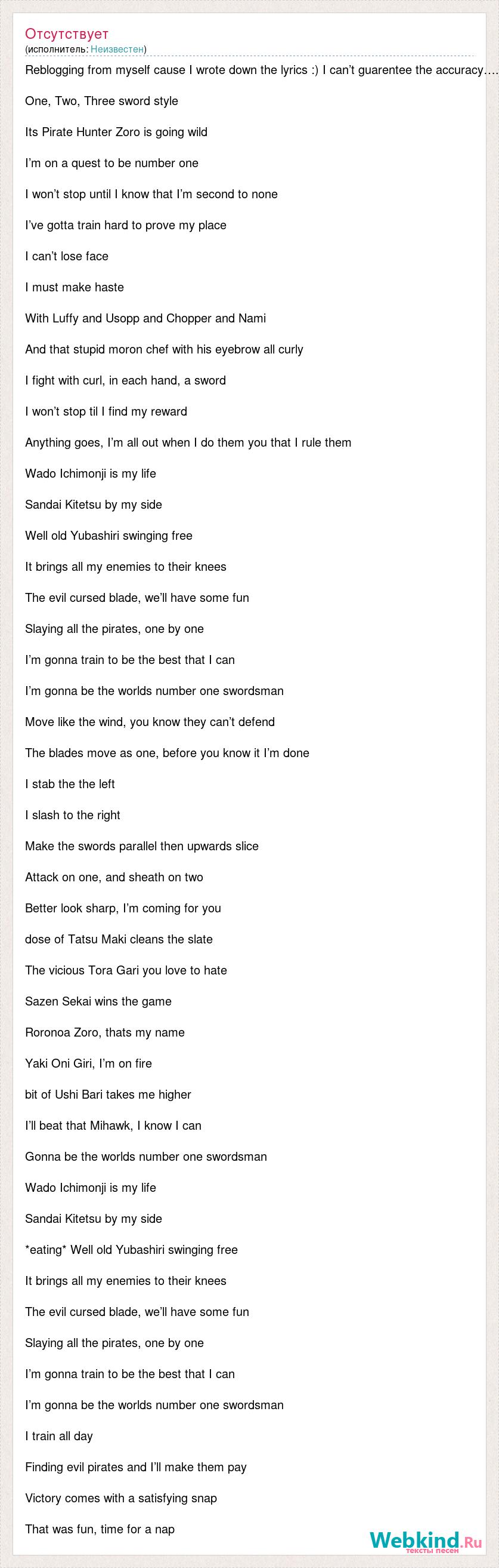 Reblogging from myself cause I wrote down the lyrics :) I can’t guarentee the accuracy…. One, Two, Three sword style Its Pirate Hunter Zoro is going wild I’m on a quest to be number one I won’t stop until I know that I’m second to none I’ve gotta train hard to prove my place I can’t lose face I must make haste With Luffy and Usopp and Chopper and Nami And that stupid moron chef with his eyebrow all curly I fight with curl, in each hand, a sword I won’t stop til I find my reward Anything goes, I’m all out when I do them you that I rule them Wado Ichimonji is my life Sandai Kitetsu by my side Well old Yubashiri swinging free It brings all my enemies to their knees The evil cursed blade, we’ll have some fun Slaying all the pirates, one by one I’m gonna train to be the best that I can I’m gonna be the worlds number one swordsman Move like the wind, you know they can’t defend The blades move as one, before you know it I’m done I stab the the left I slash to the right Make the swords parallel then upwards slice Attack on one, and sheath on two Better look sharp, I’m coming for you dose of Tatsu Maki cleans the slate The vicious Tora Gari you love to hate Sazen Sekai wins the game Roronoa Zoro, thats my name Yaki Oni Giri, I’m on fire bit of Ushi Bari takes me higher I’ll beat that Mihawk, I know I can Gonna be the worlds number one swordsman Wado Ichimonji is my life Sandai Kitetsu by my side *eating* Well old Yubashiri swinging free It brings all my enemies to their knees The evil cursed blade, we’ll have some fun Slaying all the pirates, one by one I’m gonna train to be the best that I can I’m gonna be the worlds number one swordsman I train all day Finding evil pirates and I’ll make them pay Victory comes with a satisfying snap That was fun, time for a nap
