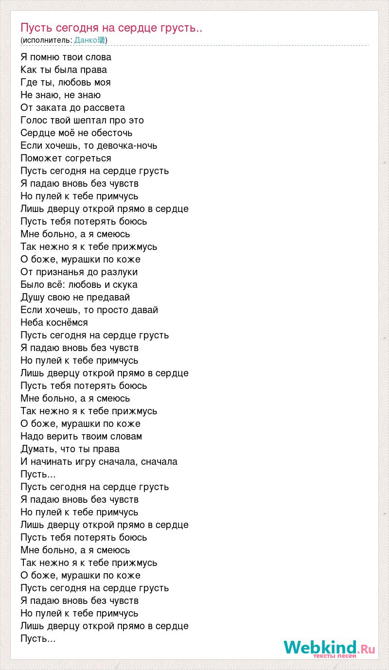Я помню твои слова Как ты была права Где ты, любовь моя Не знаю, не знаю От заката до рассвета Голос твой шептал про это Сердце моё не обесточь Если хочешь, то девочка-ночь Поможет согреться Пусть сегодня на сердце грусть Я падаю вновь без чувств Но пулей к тебе примчусь Лишь дверцу открой прямо в сердце Пусть тебя потерять боюсь Мне больно, а я смеюсь Так нежно я к тебе прижмусь О боже, мурашки по коже От признанья до разлуки Было всё: любовь и скука Душу свою не предавай Если хочешь, то просто давай Неба коснёмся Пусть сегодня на сердце грусть Я падаю вновь без чувств Но пулей к тебе примчусь Лишь дверцу открой прямо в сердце Пусть тебя потерять боюсь Мне больно, а я смеюсь Так нежно я к тебе прижмусь О боже, мурашки по коже Надо верить твоим словам Думать, что ты права И начинать игру сначала, сначала Пусть... Пусть сегодня на сердце грусть Я падаю вновь без чувств Но пулей к тебе примчусь Лишь дверцу открой прямо в сердце Пусть тебя потерять боюсь Мне больно, а я смеюсь Так нежно я к тебе прижмусь О боже, мурашки по коже Пусть сегодня на сердце грусть Я падаю вновь без чувств Но пулей к тебе примчусь Лишь дверцу открой прямо в сердце Пусть...