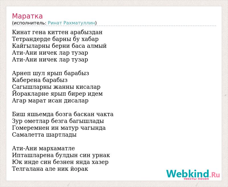 Кинат гена киттен арабыздан Тетрандерде барны бу хабар Кайгыларны берни баса алмый Ати-Ани ничек лар тузар Ати-Ани ничек лар тузар Арнеп шул ярып барабыз Каберена барабыз Сагышларны жанны кисалар Йоракларне ярып бирер идем Агар марат исан дисалар Биш яшьемда бозга баскан чакта Зур ометлар безга багышлады Гомеремнен ин матур чагында Самалетта шартлады Ати-Ани мархаматле Ипташларена булдын син урнак Юк инде син безнен янда хазер Телгалана але ник йорак
