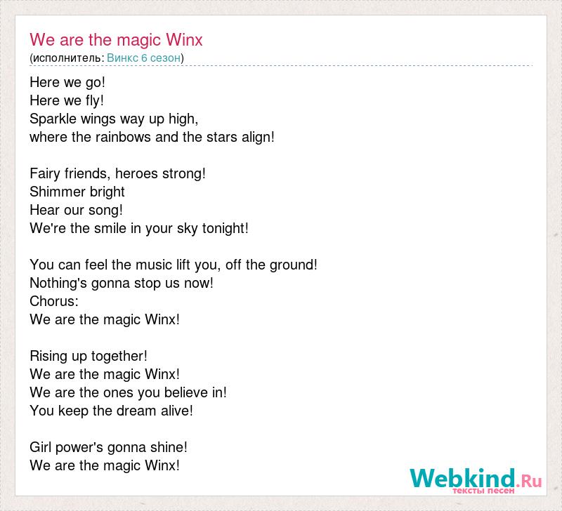 Here we go! Here we fly! Sparkle wings way up high, where the rainbows and the stars align! Fairy friends, heroes strong! Shimmer bright Hear our song! We're the smile in your sky tonight! You can feel the music lift you, off the ground! Nothing's gonna stop us now! Chorus: We are the magic Winx! Rising up together! We are the magic Winx! We are the ones you believe in! You keep the dream alive! Girl power's gonna shine! We are the magic Winx!