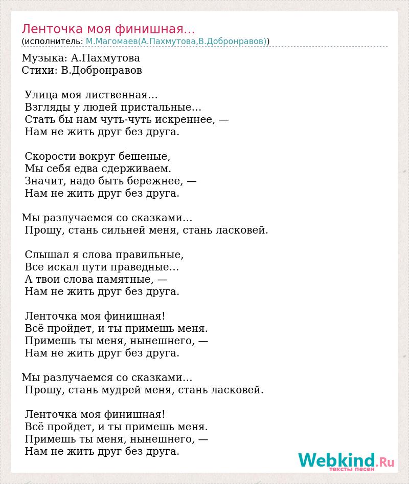 Музыка: А.Пахмутова Стихи: В.Добронравов Улица моя лиственная… Взгляды у людей пристальные… Стать бы нам чуть-чуть искреннее, — Нам не жить друг без друга. Скорости вокруг бешеные, Мы себя едва сдерживаем. Значит, надо быть бережнее, — Нам не жить друг без друга. Мы разлучаемся со сказками… Прошу, стань сильней меня, стань ласковей. Слышал я слова правильные, Все искал пути праведные… А твои слова памятные, — Нам не жить друг без друга. Ленточка моя финишная! Всё пройдет, и ты примешь меня. Примешь ты меня, нынешнего, — Нам не жить друг без друга. Мы разлучаемся со сказками… Прошу, стань мудрей меня, стань ласковей. Ленточка моя финишная! Всё пройдет, и ты примешь меня. Примешь ты меня, нынешнего, — Нам не жить друг без друга.