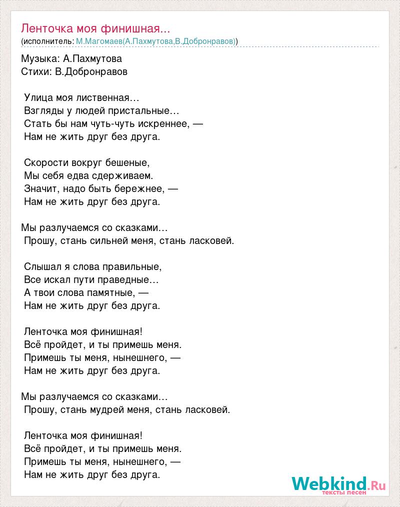 Музыка: А.Пахмутова Стихи: В.Добронравов Улица моя лиственная… Взгляды у людей пристальные… Стать бы нам чуть-чуть искреннее, — Нам не жить друг без друга. Скорости вокруг бешеные, Мы себя едва сдерживаем. Значит, надо быть бережнее, — Нам не жить друг без друга. Мы разлучаемся со сказками… Прошу, стань сильней меня, стань ласковей. Слышал я слова правильные, Все искал пути праведные… А твои слова памятные, — Нам не жить друг без друга. Ленточка моя финишная! Всё пройдет, и ты примешь меня. Примешь ты меня, нынешнего, — Нам не жить друг без друга. Мы разлучаемся со сказками… Прошу, стань мудрей меня, стань ласковей. Ленточка моя финишная! Всё пройдет, и ты примешь меня. Примешь ты меня, нынешнего, — Нам не жить друг без друга.