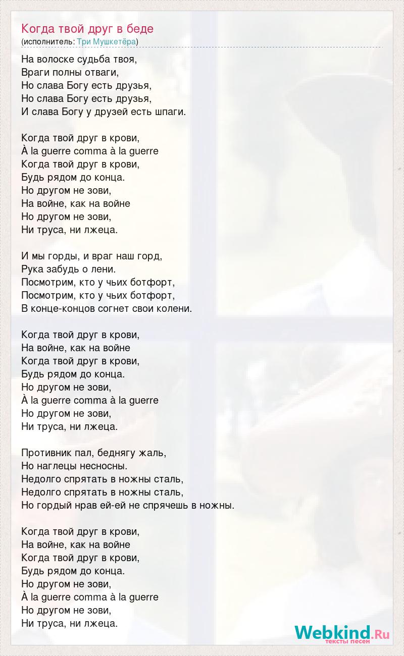 На волоске судьба твоя, Враги полны отваги, Но слава Богу есть друзья, Но слава Богу есть друзья, И слава Богу у друзей есть шпаги. Когда твой друг в крови, À la guerre comma à la guerre Когда твой друг в крови, Будь рядом до конца. Но другом не зови, На войне, как на войне Но другом не зови, Ни труса, ни лжеца. И мы горды, и враг наш горд, Рука забудь о лени. Посмотрим, кто у чьих ботфорт, Посмотрим, кто у чьих ботфорт, В конце-концов согнет свои колени. Когда твой друг в крови, На войне, как на войне Когда твой друг в крови, Будь рядом до конца. Но другом не зови, À la guerre comma à la guerre Но другом не зови, Ни труса, ни лжеца. Противник пал, беднягу жаль, Но наглецы несносны. Недолго спрятать в ножны сталь, Недолго спрятать в ножны сталь, Но гордый нрав ей-ей не спрячешь в ножны. Когда твой друг в крови, На войне, как на войне Когда твой друг в крови, Будь рядом до конца. Но другом не зови, À la guerre comma à la guerre Но другом не зови, Ни труса, ни лжеца.